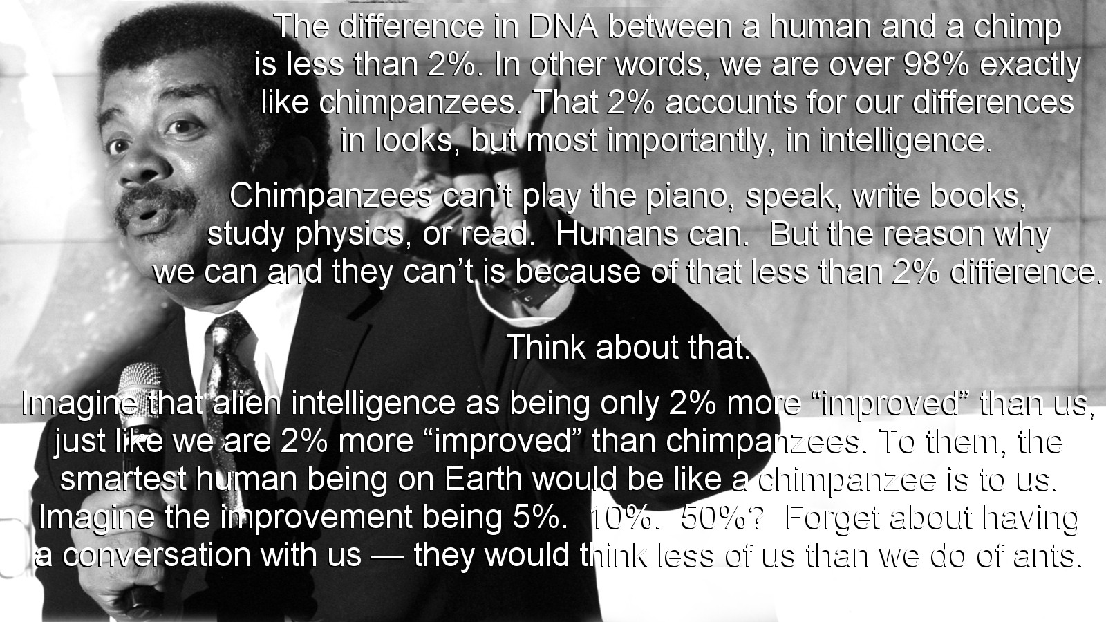 Such an interesting thought to entertain with respect to gaining perspective. That doesn’t just reflect how amazing life really is (essentially all we know and understand is in that 2%), but that for all we know, aliens gave us a passing glance and that was it.