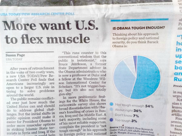 Somehow, as Fairness and Accuracy in Reporting stated, “a larger role in trying to solve problems around the world” translates for USA Today into “more want US to flex muscle.”