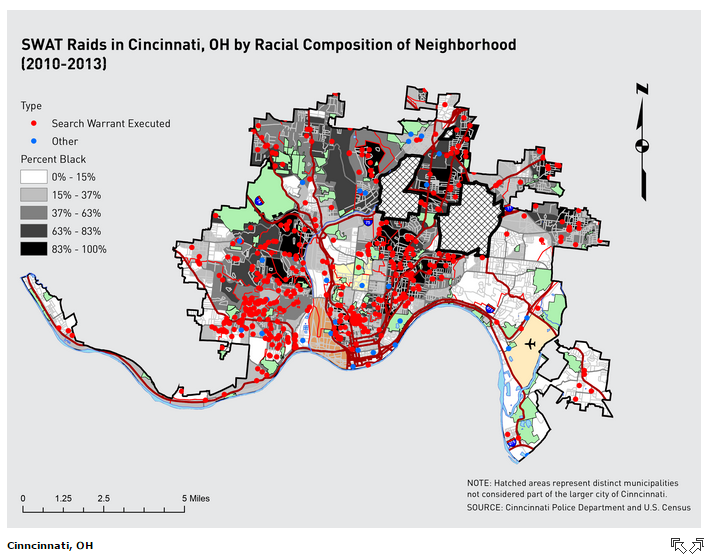 Let’s flip it. Is it that blacks are committing more of the crimes or do the police prey on low-income, black neighborhoods more than low/middle-class white neighborhoods? Google the ACLU’s map of SWAT raids in Cincinnati and you’ll find that they do, in fact, target black neighborhoods more. Here’s that map: