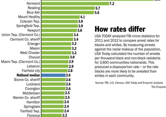 The Cincinnati Enquirer posted a story about how often blacks are arrested compared to whites in Cincinnati areas. They provided this chart mapping the rate of black arrests versus white: