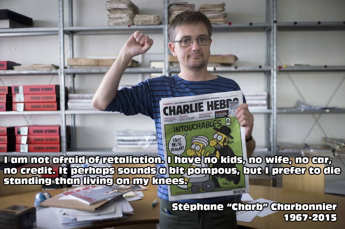 The cartoonists at Charlie Hebdo were a collection of those guys. Equal opportunity offenders, “taking the piss,” out of authority and rightfully so. Authority always needs a swift kick in the shins to remind them where they stand (usually on the neck of the majority).