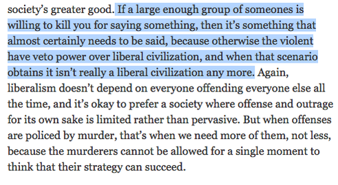 It’s easy to defend free speech of someone saying the things you like or the things within the narrowly accepted mainstream viewpoint, but it’s much harder to say, “Yeah, you Westboro Baptist fuckers, I defend your right to spew your stupid shit.” It’s much harder to be that guy.