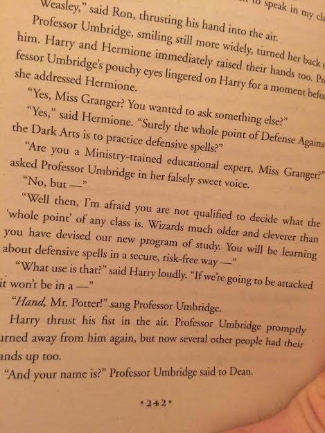 Because that’s the gist of this massive book: Harry Potter witnessed and freaking fought Voldemort last year (in the fourth book’s conclusion), but the Ministry of Magic does not want to believe him, so they, along with the media, The Daily Prophet, set out a propaganda campaign to discredit Harry, Dumbledore and anyone that dares thing Voldemort is back. Even worse, the Ministry sends Dolores to Hogwarts to gradually take over the school with her ridiculous rules, bans, detention and curriculum. She’s the new Defense Against the Dark Arts professor, but she doesn’t want them to learn any defensive magic, as she feels there’s no need for that. The subject is purely academic. And thus, she has this exchange with Hermione: