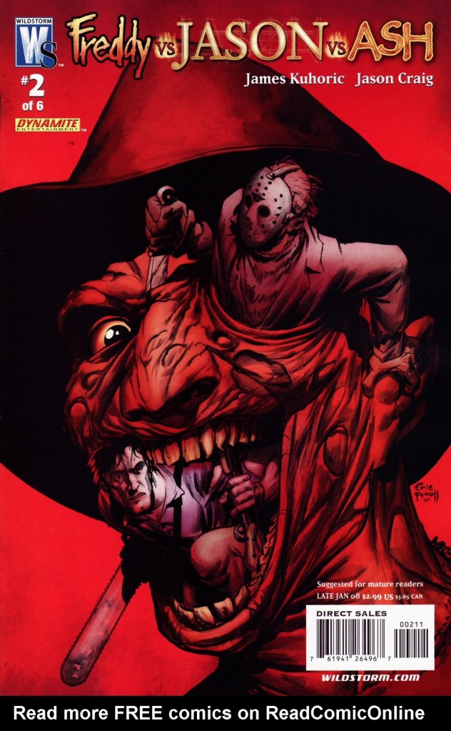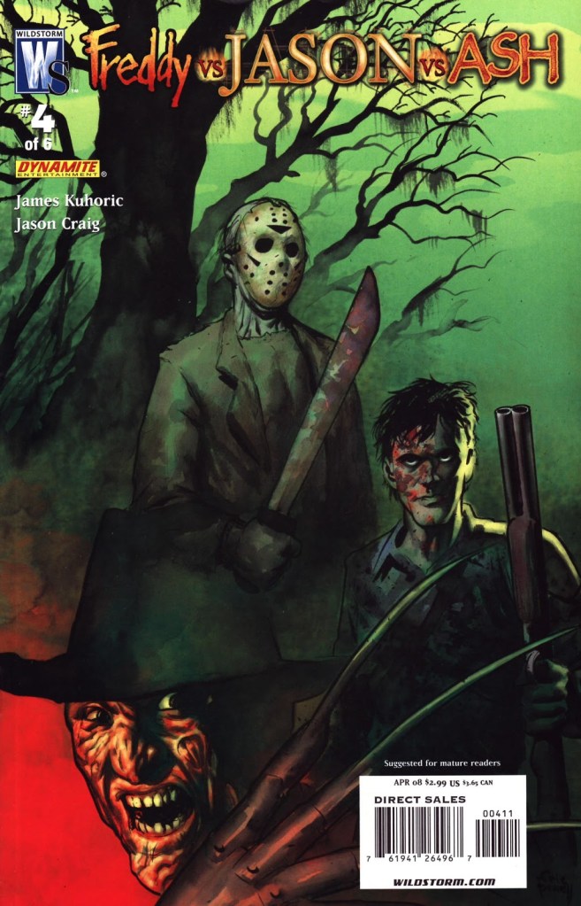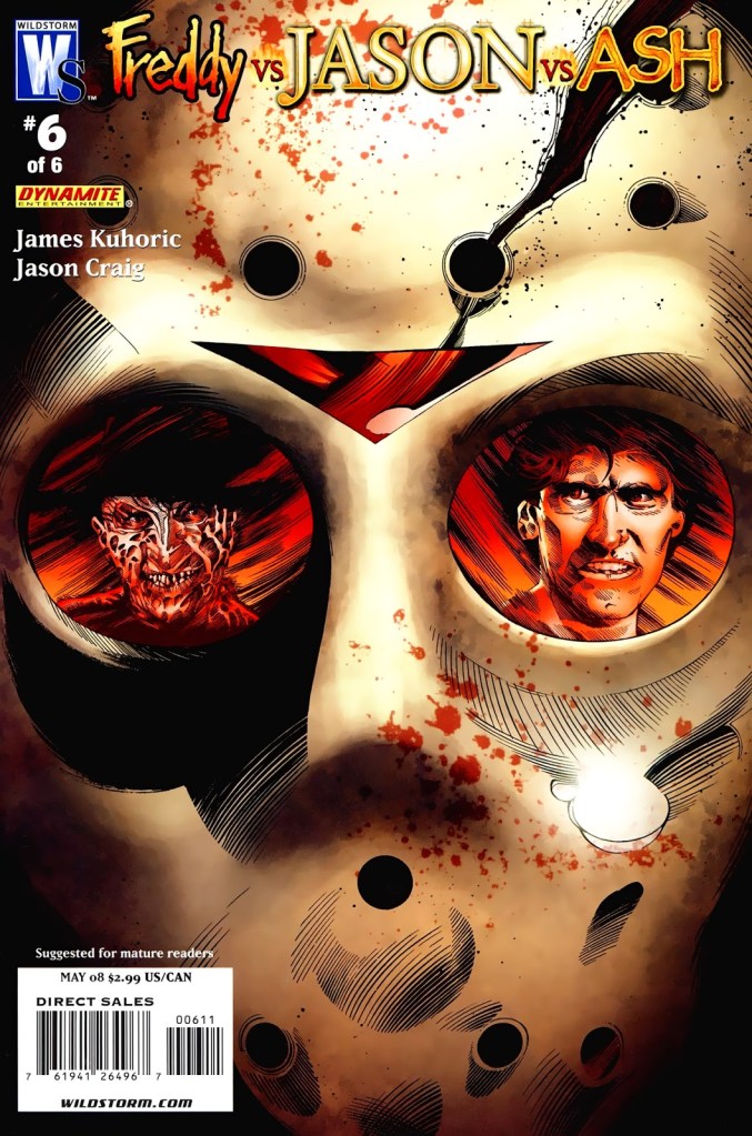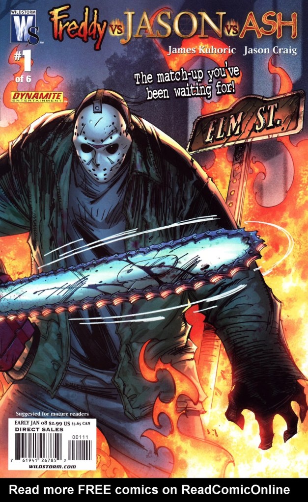Believe it or not, there was indeed a “sequel” to 2003’s Freddy vs. Jason … but in comic book form! That is, the six-issue limited comic book series released in November 2007 through March 2008, and published by WildStorm and Dynamite Entertainment. WildStorm was an imprint under DC Comics. Dynamite Entertainment appears, going by Wikipedia, to be an imprint of Dynamite Forces that primarily publishes adaptations of franchises from other media. That makes sense for this given that this comic book series was based on the Freddy vs. Jason 2 film treatment by Jeff Katz. Katz apparently started his career in pro wrestling, and then moved on to Freddy vs. Jason, as a producer with New Line Cinema, and comic books … alrighty then.