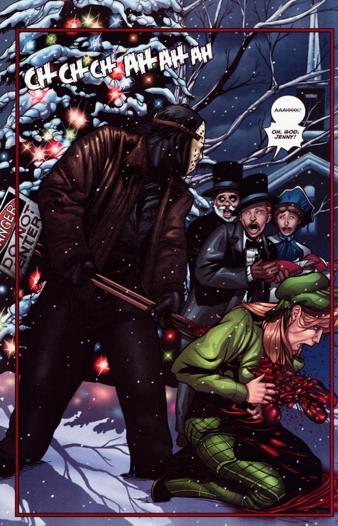 I just love these images of Jason Voorhees juxtaposed with winter and Christmas iconography. It’s something we haven’t seen before! Like this panel, where he kills a bunch of Christmas carolers. Give me the Jason Voorhees Black Christmas crossover!