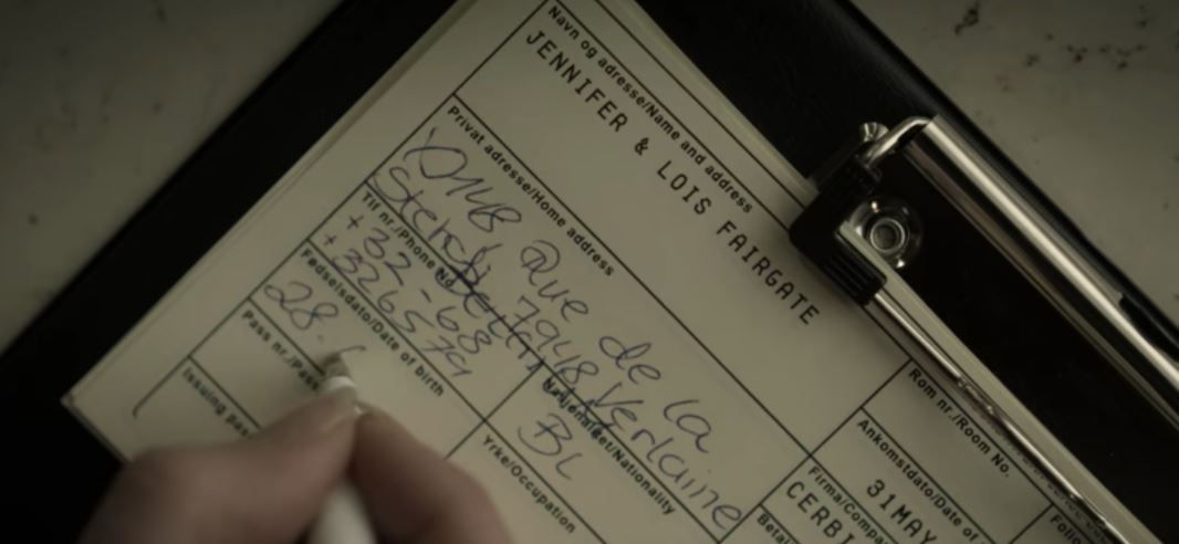 Also, why did it take the luxury hotel in Oslo three days to realize, wait a minute, she didn’t use a credit card for her stay? Although, later we see on the registration card that she indicated she was paying with cash. Well, did she?