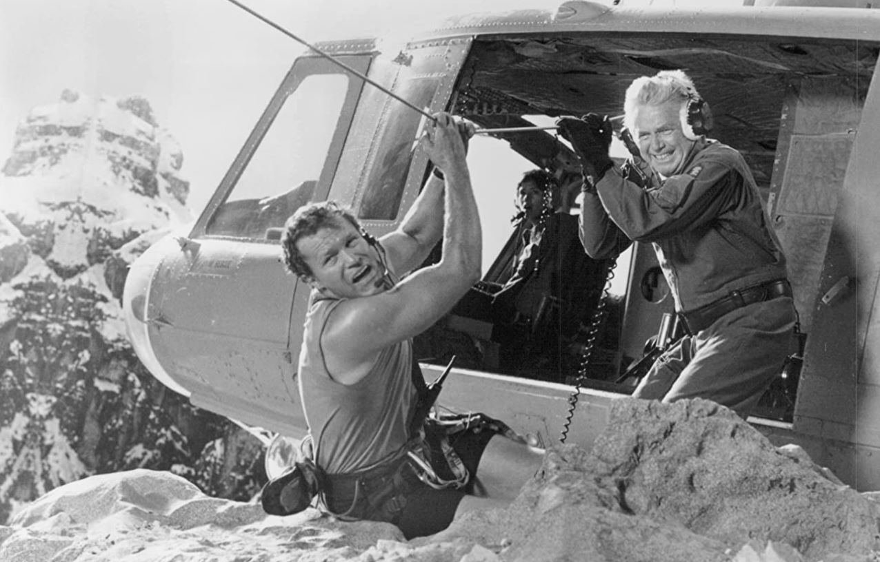 The opening scene sets the stage nicely, where Hal and his girlfriend, Sarah (played by Michelle Joyner), are stuck one of the peaks. Gabe comes to save them, but Sarah’s equipment malfunctions mid-transfer to the rescue helicopter. Gabe holds onto her by one hand while dangling from the rope, but she slips and falls to her death. It was a heck of a scene! I figured some sort of equipment malfunction would happen, but I didn’t expect Sarah to actually plunge to her dang death. That was intense and shocking. Which is both a compliment of the film and one of its detriments, as nothing quite lives up to that opening scene in intensity and acrophobia vibes until at least the climaxing scene when Gabe and Qualen duke it out on a helicopter dangling off a rock façade. That made the film darker than I was expecting because Gabe is questioning himself and Hal hates him.