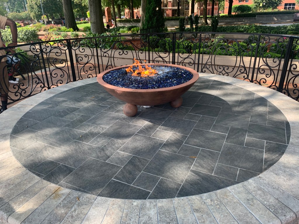 The tombstones are centered in the middle of the most gorgeous reflecting pool I’ve ever seen — the most striking blue water. There’s also an eternal flame opposite the reflecting pool.