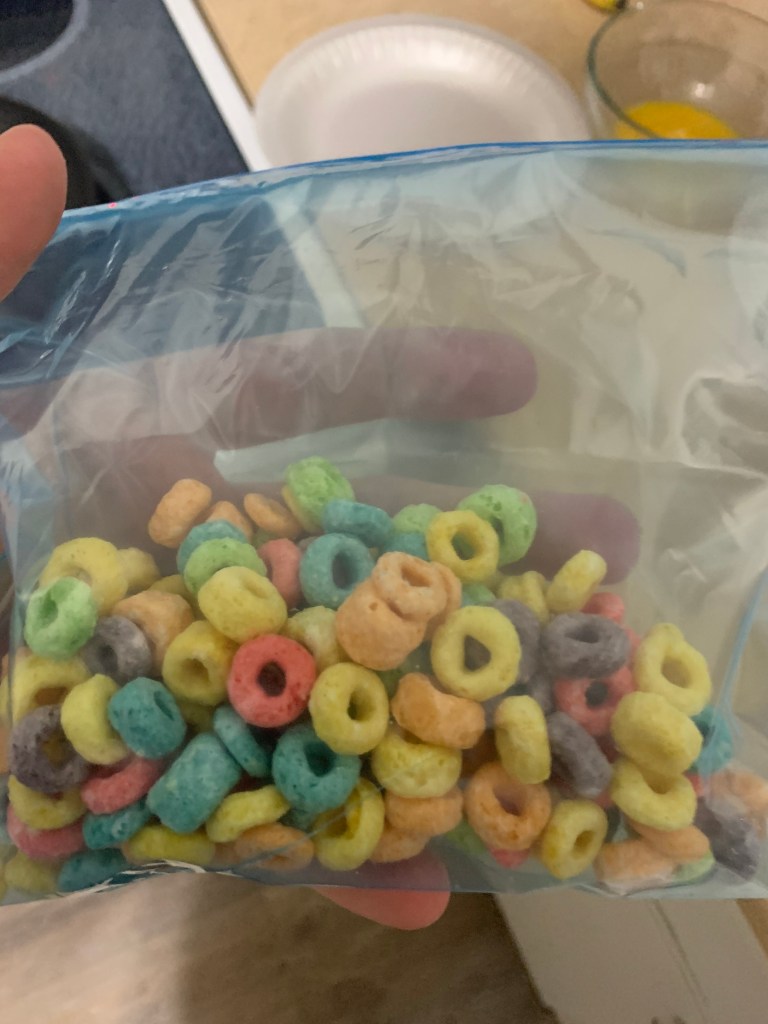 However, tonight, I did not have Cap’n Crunch Peanut Butter cereal, but I did have Froot Loops. If you’ve read my blog, you know I have a love-hate relationship now with Froot Loops, but, I made up with them tonight to do this. More than the taste, I wanted the aesthetic of a rainbow-looking breaded chicken breast.