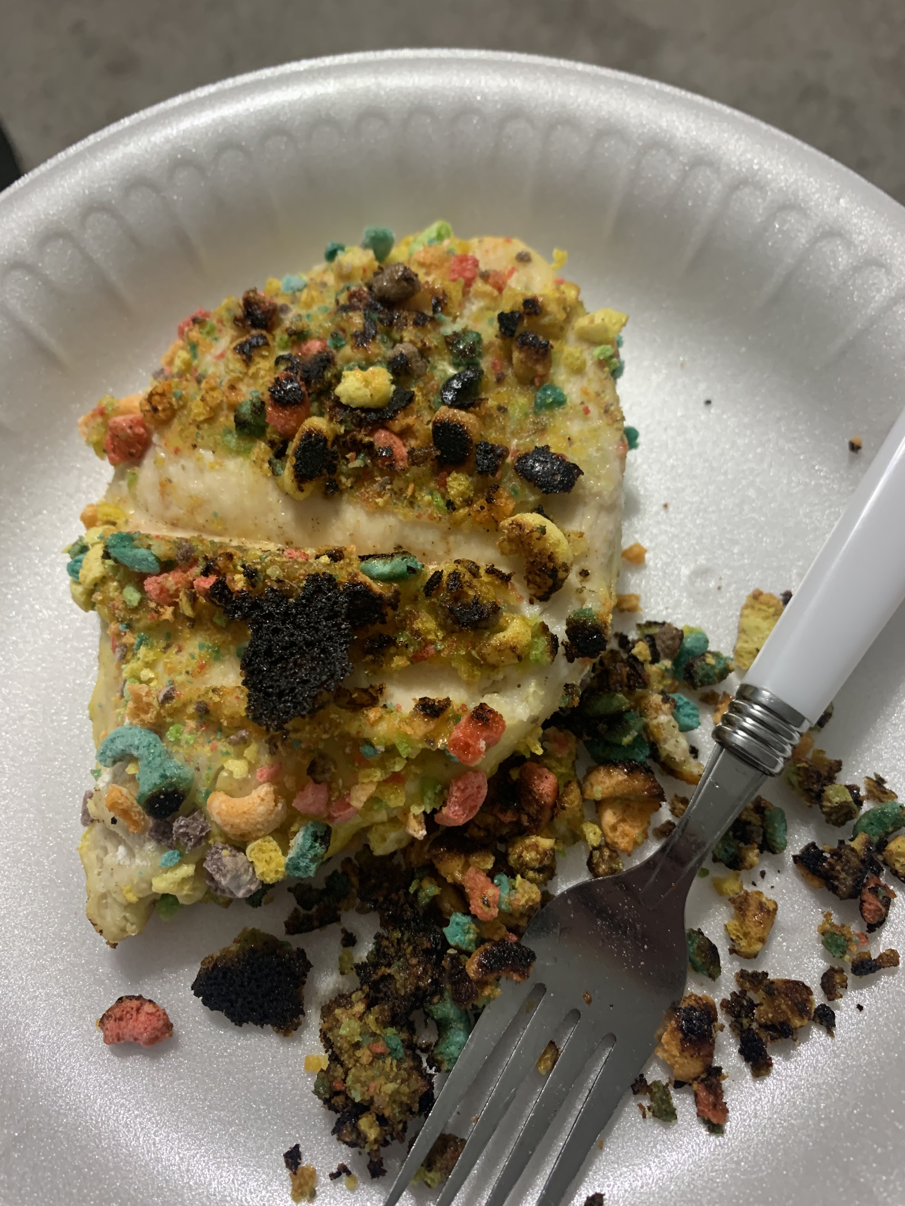 Don’t forget to turn off the burner once the chicken is done! And now you’re ready to eat. I still hold to my earlier position that the peanut butter cereal works the best because the Froot Loop taste didn’t come through much here at all. However, I did get the colorfulness! Chicken cooked on stovetop and generously seasoned like this, breaded or not, always comes out juicy in my experience. The trick is to hit that spot between undercooking it and overcooking it to where it’s dry. This chicken was juicy and had some fun fried Froot Loop bits to go with it. One day I will master a juicy baked chicken, but today wasn’t that day.