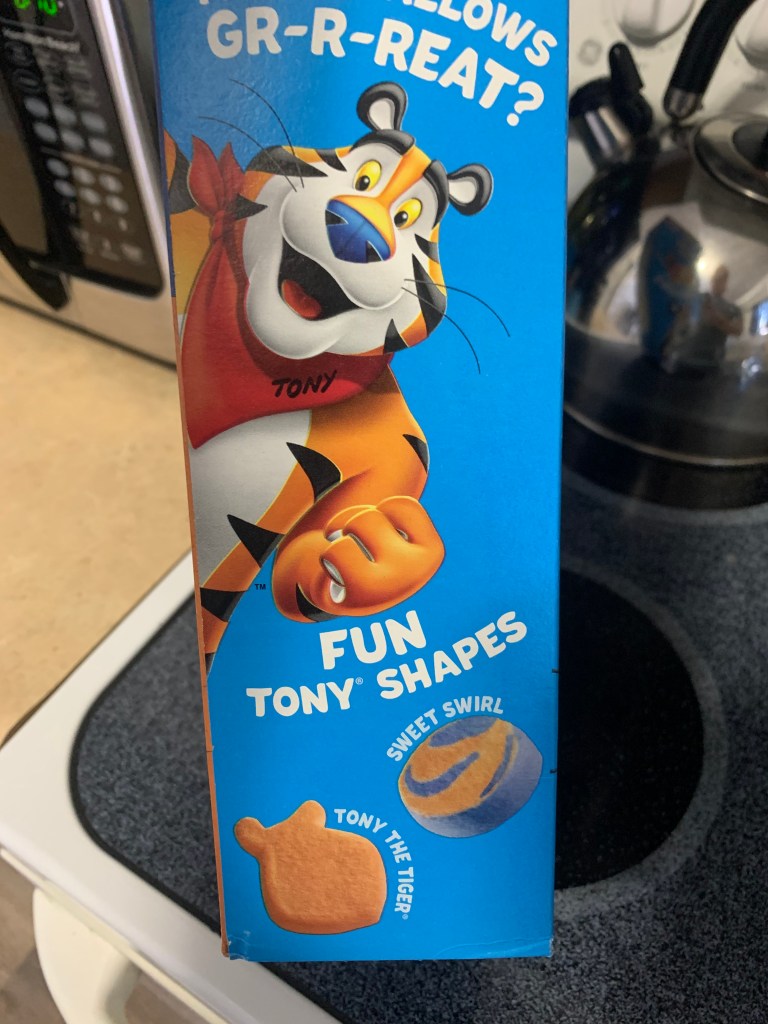 And the side of the box promises fun Tony (the Tiger!) shapes, like sweet swirl and Tony the Tiger himself. To be honest, the latter looks more like a goldfish to me. Besides, when it comes to marshmallow shapes, they don’t look like much of anything besides imminent yumminess in my mouth.