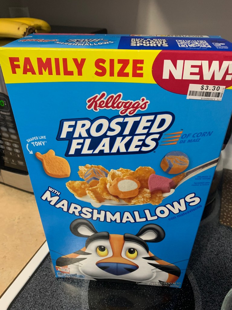 Alright guys. If you’ve been following this blog for a while, you have to give me some credit on this one. I saw Kellogg’s Frosted Flakes was coming out with marshmallows and I held off for so long. I believe they hit stores sometime in May 2020. I showed such restraint! I’m always swooping up the latest gimmick cereal and this one isn’t even that much of a gimmick. It’s just putting two sugary awesome things together and saying, “Have at it,” and I so wanted to! Nonetheless. I finally relented and picked up a family size box of it. Spoiler alert: Putting two sugary awesomeness things in your mouth (with two percent milk!) was shockingly delicious.
