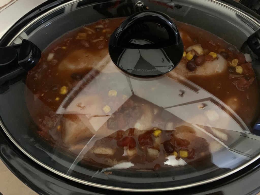 So, once all the ingredients are in the crockpot, I followed the recipe by turning it to low heat and leaving it alone for five hours. At the five hour mark, I got my knife out and awkwardly cut the chicken breasts down to smaller pieces, returned it to the crockpot and let it cook for another two hours. I will say, it was incredibly hard not to start chomping on those thick pieces of juicy-looking chicken!