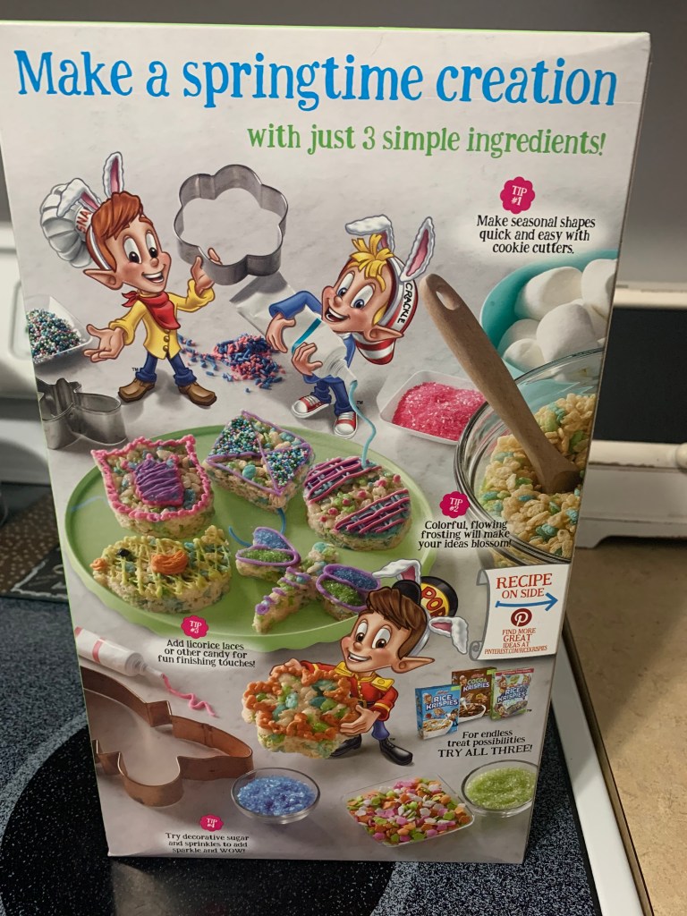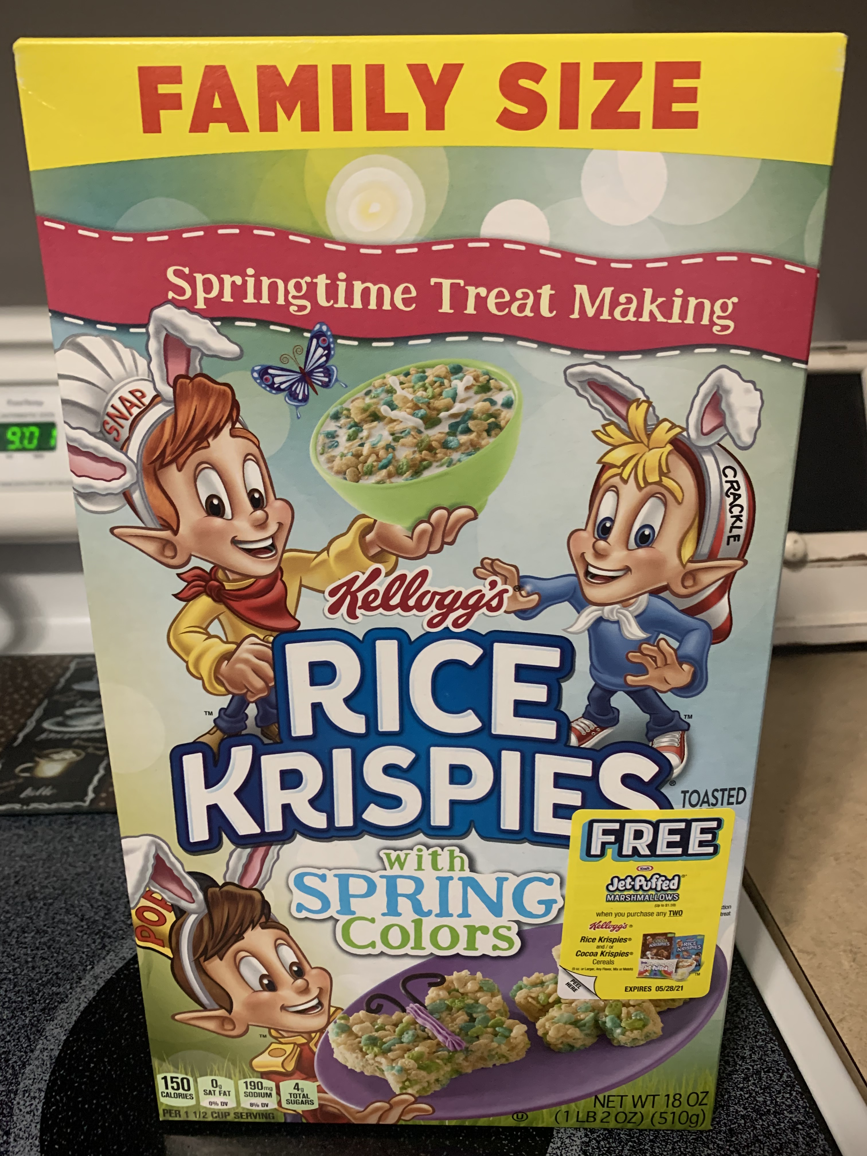 There is a handy recipe for Rice Krispies on the side; all you need is marshmallow mix and butter to go with the cereal. Maybe I’ll give that a whirl.
