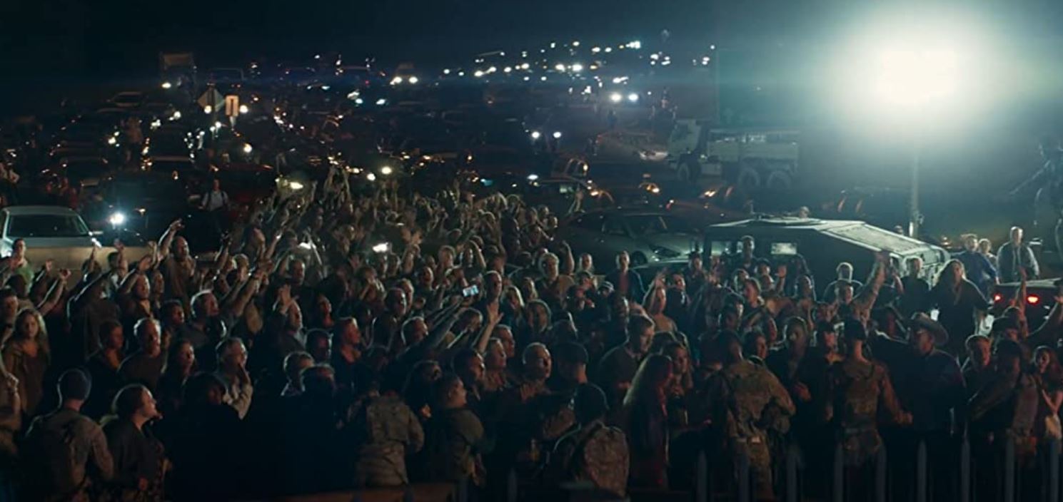 However, as both try to journey to Lexington, they run into issues. First, Morena and the kid run into a psychotic couple who pushes her out of the car and kidnaps the kid in a bid to get on the plane. A fun connection to today’s earlier review of Mare of Easttown is that the psycho man of the couple is played by David Denman, who is Frank Sheehan (Mare’s ex-husband) in the TV series. Fortunately, the kid is brave as hell and tells the military he’s been kidnapped, and they separate him from the psycho couple. Meanwhile, Gerard gets into a caravan heading north — wherein he overhears the pivotal information about going to Canada and then to Greenland to the bunkers — where two psychos try to steal his wristband, which allows him to get onto the military planes. He ends up having to kill one of them, though.
