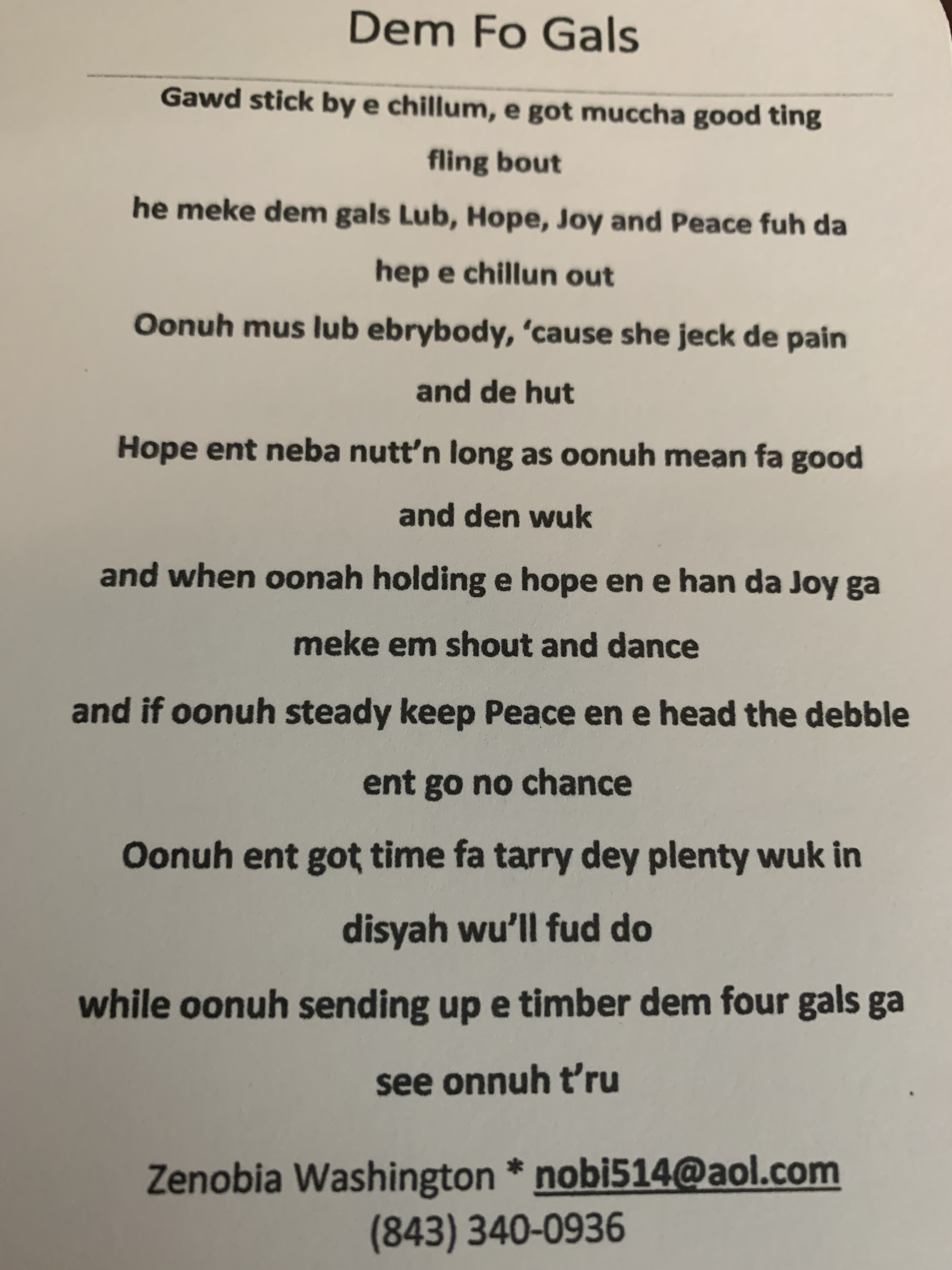 Zenobia Washington, who did the Gullah portion of the tour, shared a poem she wrote written in English and also in the language the Gullah people would have written it in: