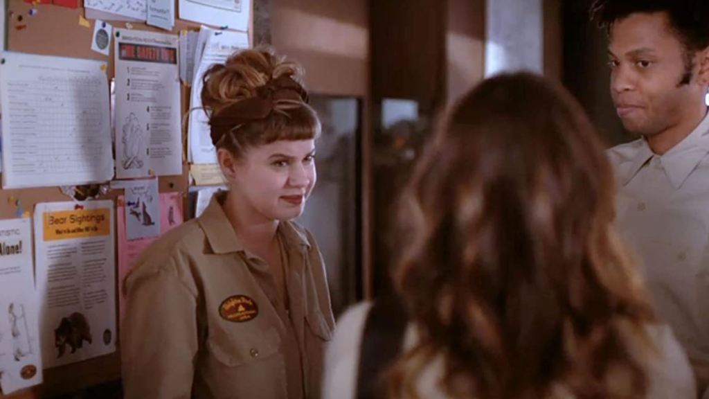 In between the zany beginning and the heart-pounding bear finale, Wendy wants to prove that she can handle working that trail. Instead, she gets lost. Then she finds the dead body. And to make matters worse, there’s another guy up there with her. Is he the murderer?! He even comes back later to “stalk” her and seems to be trying to kill her. She kicks him off the mountain and he takes a heck of a free fall to his death.