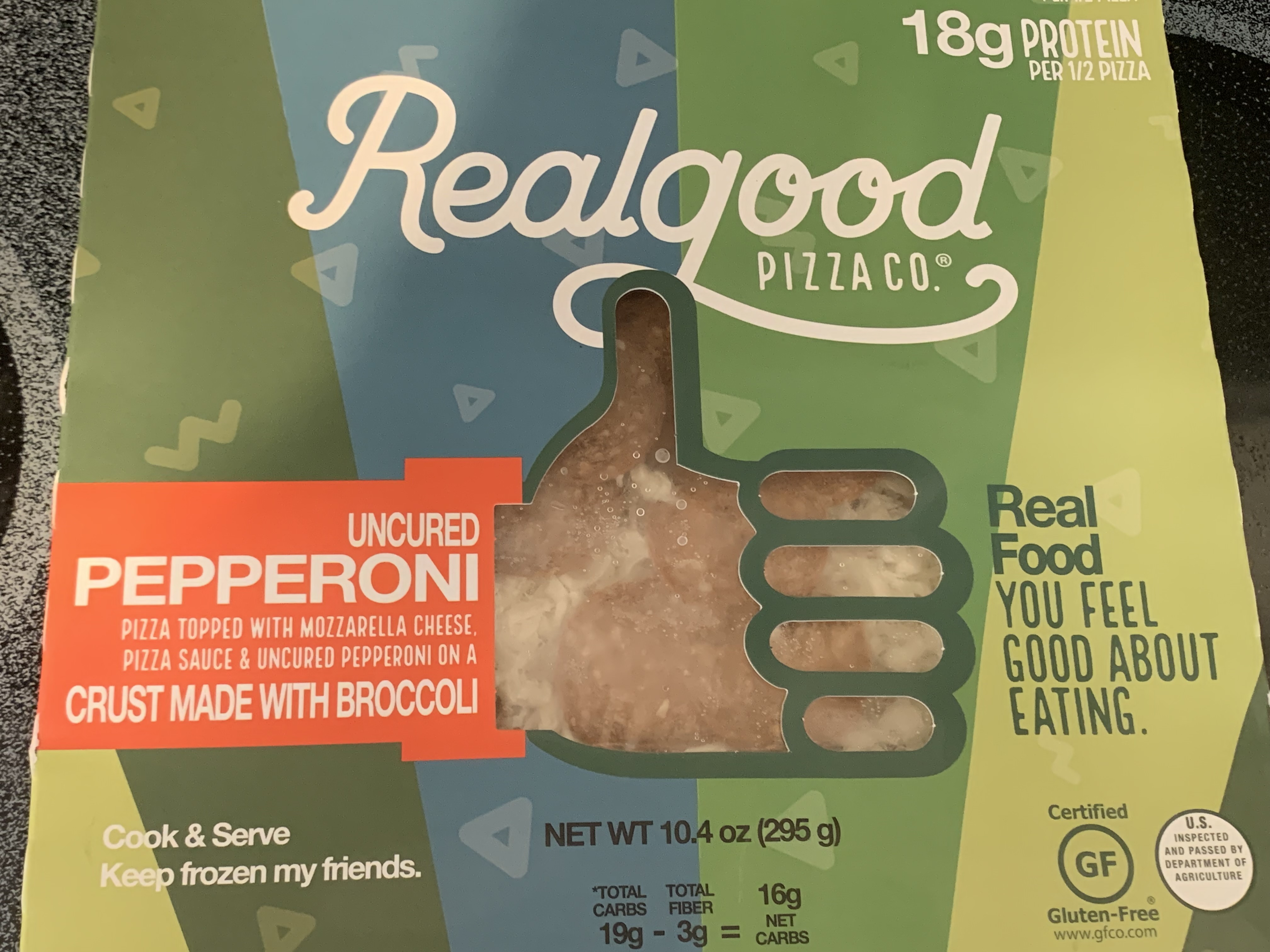 Realgood Pizza Co. makes a frozen pizza with a crust made with broccoli. And their slogan seems even tailored made for my preference, “Real food you feel good about eating.” In addition, the pizza is jam packed with protein, offering 18 grams of pizza per serving, which is half the pizza. Each half is 340 calories.