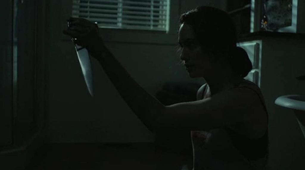 She then moves to the bathroom to protect herself. Failing to break through the backdoor, The Man breaks through the bathroom skylight and is in a bathtub directly behind Maddie. She didn’t hear a thing, of course. That is, until the cocky, underestimating Man taunts Maddie once again and this time, she feels his breath upon her neck. She stabs him in the knee.