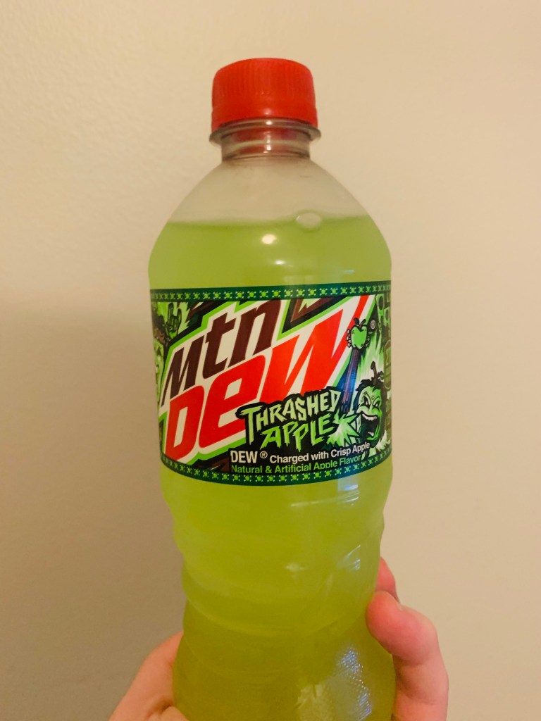 Anyhow, what I am a sucker for is snazzy advertising that sticks in my brain and such is the case with the apparently Kroger grocery story exclusive Mountain Dew Thrashed Apple promising a Dew “charged with crisp apple.” I’ve sent it while shopping at Kroger many a time and I got that dang hankering!