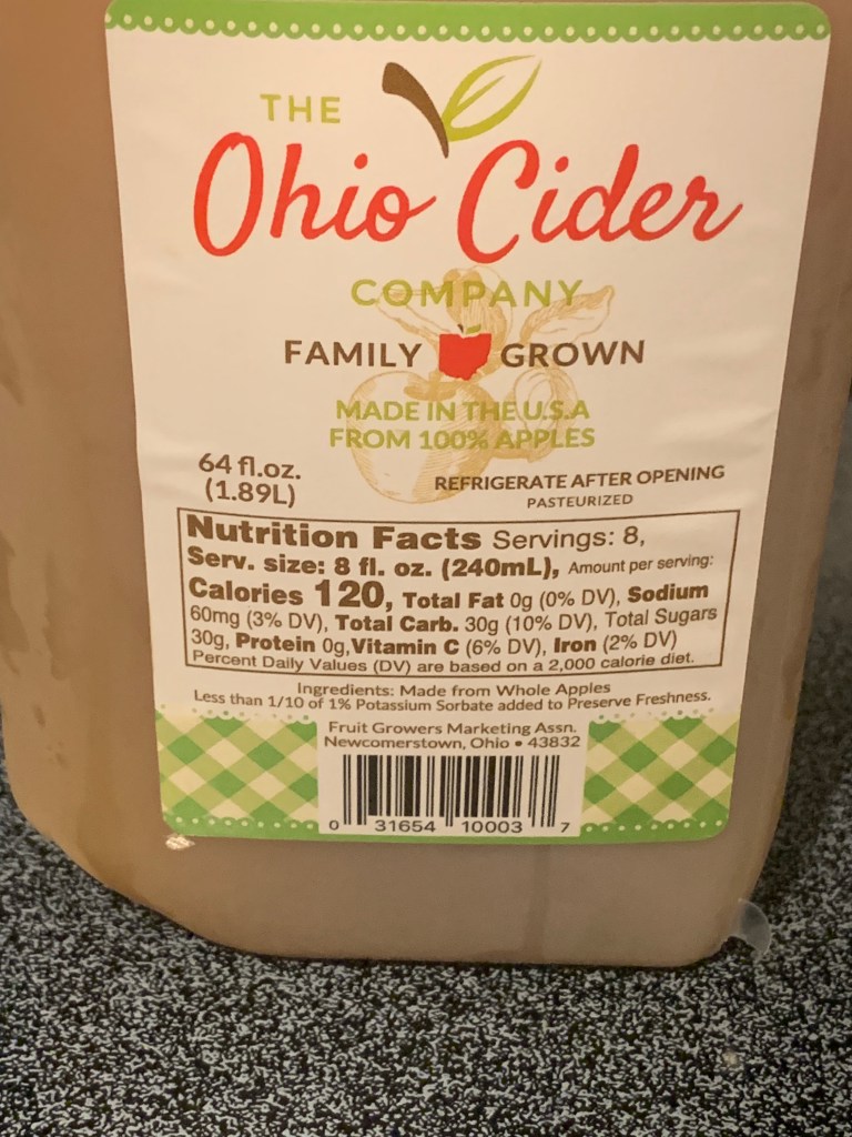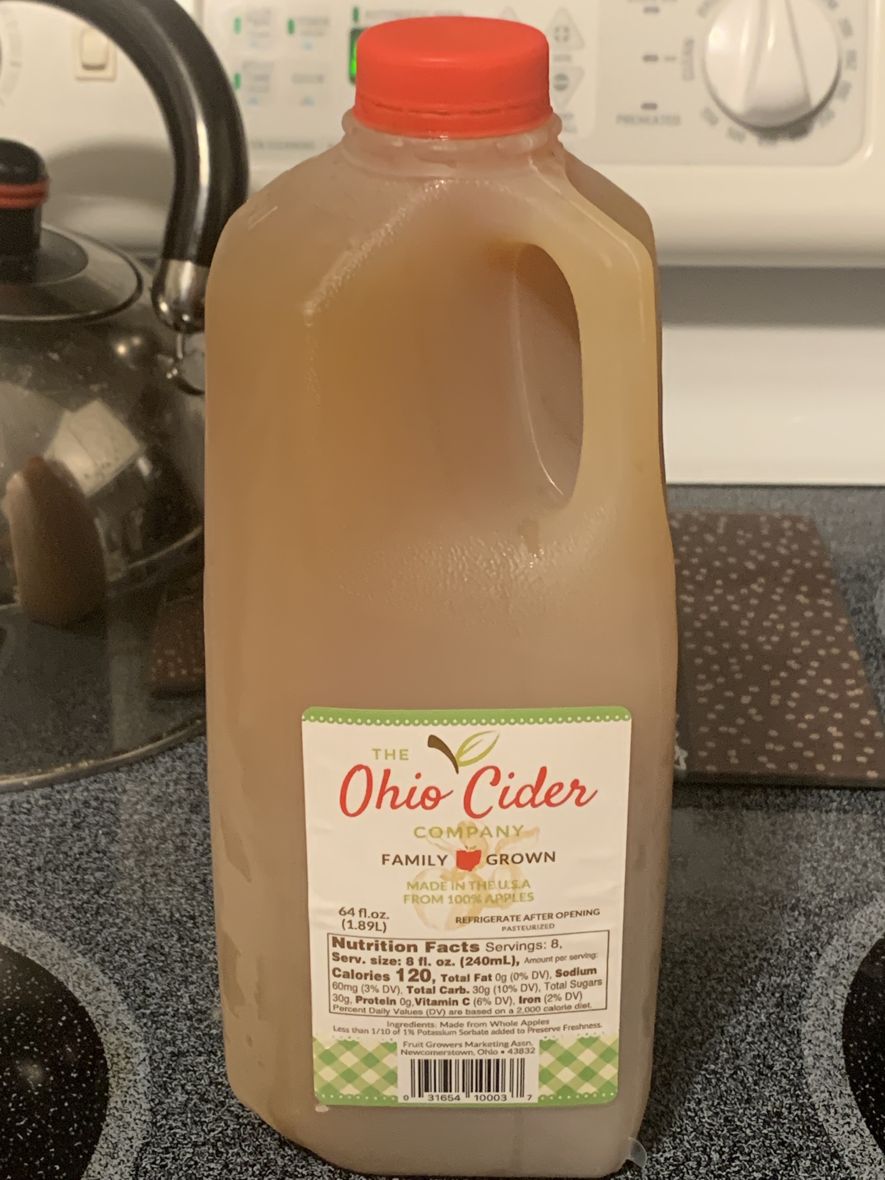 So, I have the half gallon here and according to Fresh Forward Farms, it takes 40 apples to make one gallon of cider. I’m not good at math, but that tells me it took 20 lovely apples to make my half gallon of cider.