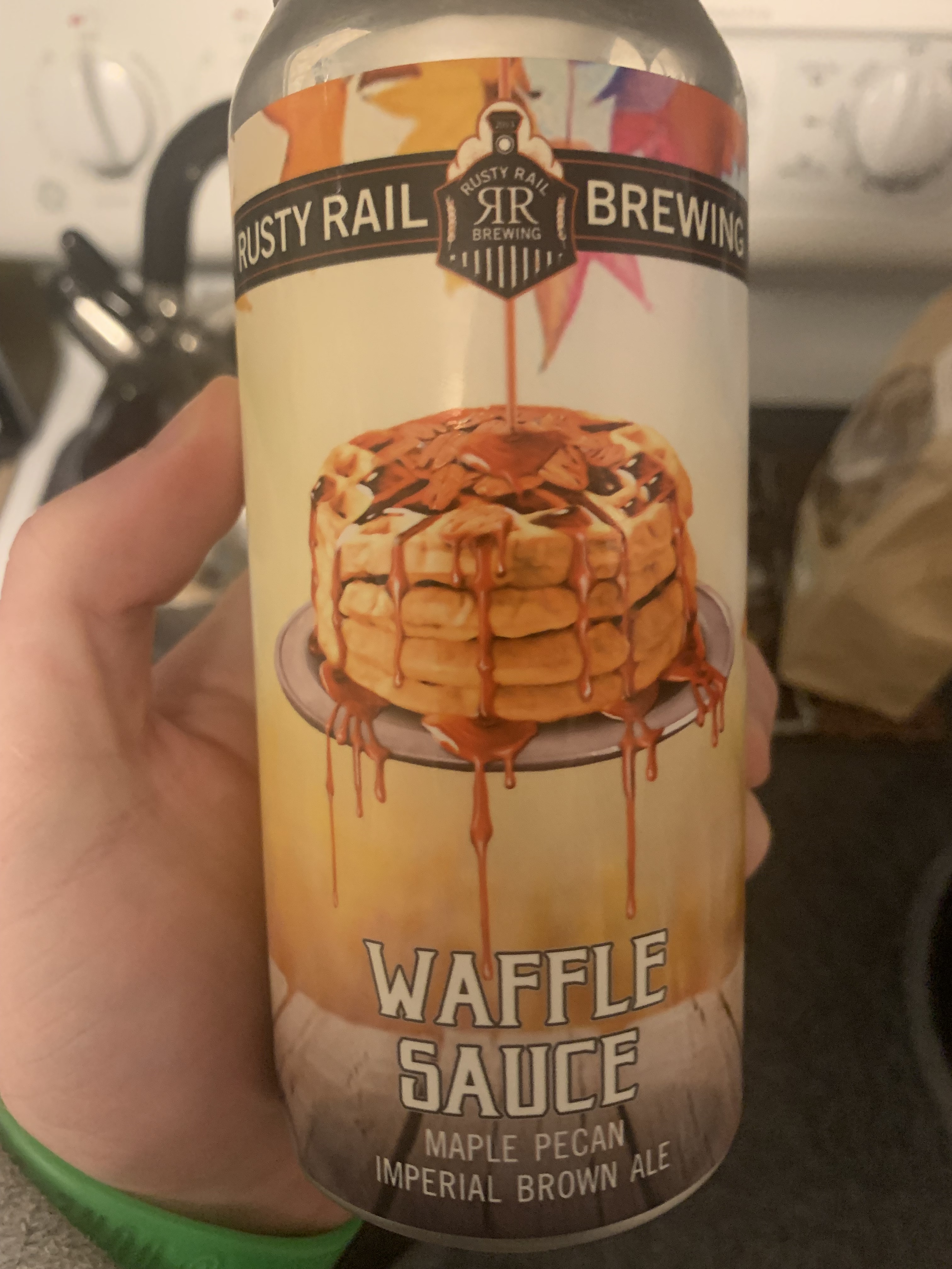 I AM IN. In fact, the ellipses are misleading because I didn’t even hesitate that long before committing and putting that bad boy in my shopping cart. If there’s any hesitation, it’s that craft beers, particularly if they are local, can be expensive. I believe for only four cans (and these are tall cans, at least), it was $10 and some change. Eek! Rusty Rail isn’t particularly local, as they are based out of Mifflinburg, Pennsylvania. But they tend to have a lot of goofy ones (I say with the utmost appreciation for all things goofy), apparently, such as a birthday cake-inspired ale, a caramel peanut imperial brown ale, a rainbow milkshake IPA and a pretty kitty hazy IPA, which is flavored like cotton candy. I think the latter is the only one wackier than the Waffle Sauce one I picked up, which is sweet maple flavor and aroma, with subtle pecan flavor on the finish.