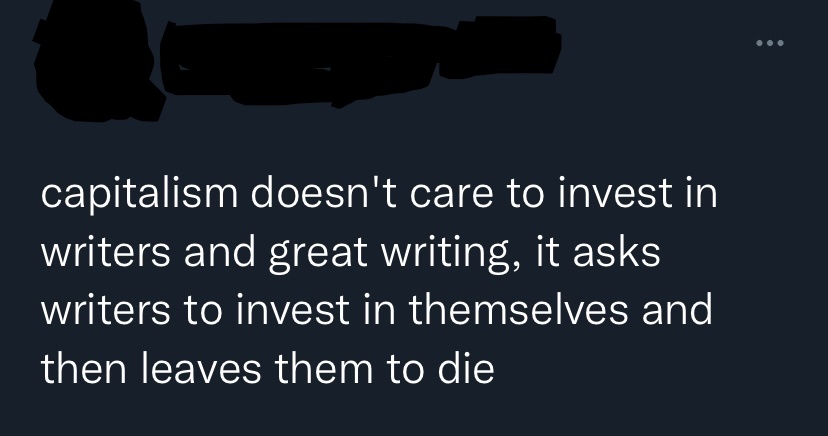 For an example of anti-capitalism or anti-free market mindset I saw recently on writing Twitter came from a lit mag; I found it rather myopic and dark: