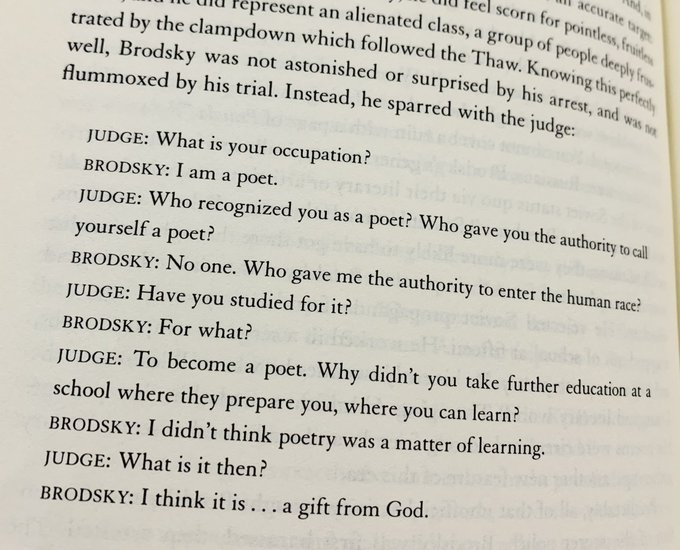To get back on a more positive note, enjoy this exchange between poet Joseph Brodsky and a judge; Brodsky did not care one iota about the stupid State’s accosting of him: