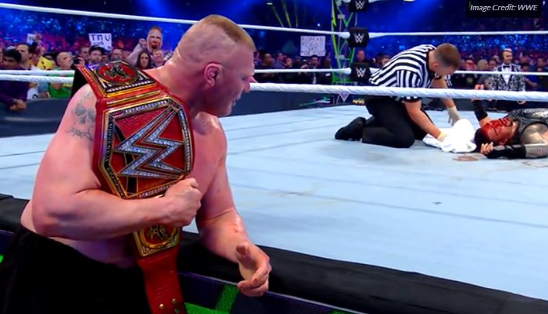 Come match time, they play up this story of Roman being overmatched. Within 30 seconds of the match starting, Brock hits his finishing move, the F5, on Roman. But he doesn’t want to go for the pin; he wants to teach Roman a lesson, and it probably didn’t help that in the initial melee, Roman actually cut Brock on the cheekbone and you could see it swelling. Brock starts suplexing Roman around like he did Cena at Summerslam. To the point where Brock off-the-cuff coins what’s been his calling card ever since, “Suplex city, bitch!” But something weird is happening … Roman is laughing. He’s egging Brock on. So, yeah, he’s overmatched, but he’s game. Roman gets a little bit of offense in, but Brock overpowers him every single time in brutal fashion. In fact, Brock looks worse in the face, at least, because Roman hits a sick knee to his head, causing Brock to bleed from the mouth, and later he drives Brock’s face into the steel ring post, where Brock is cut open on the forehead (in what I believe is a hard-way, meaning he was legitimately busted open instead of intentionally blading his forehead). As the match progresses, Brock visibly gets more and more perplexed that Roman keeps getting up and is laughing. So, after Roman kicks out of an F5, he takes his gloves off and starts slapping the crap out of Roman. But Roman’s got that Samoan blood and jaw, baby! He’s still laughing! Thanks to the Brock being bloody and woozy after the ring post spot, Roman is able to rally with his Superman punches, which Brock sells like a drunkard and it’s amazing, and hits two spears, but it’s still not enough to beat Brock, the Beast Incarnate. That’s when Roman’s former Shield buddy, Seth Rollins, comes down with the Money in the Bank briefcase, cashes it in, turning the match into a triple threat match. He’s able to pull off, as Michael Cole calls it on commentary, the “Heist of the Century!” by pinning Roman.
