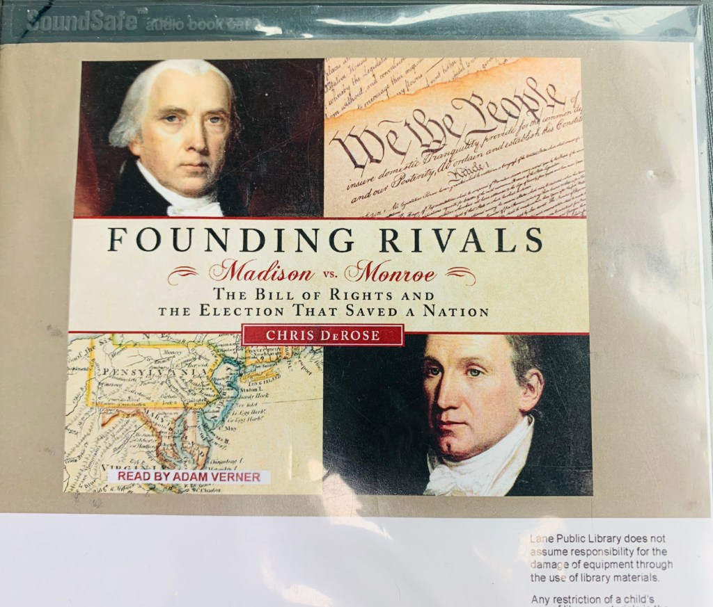 And in my latest book read (well, listen since it was an audiobook) on the founding period was Chris DeRose’s 2011 book, Founding Rivals: Madison vs. Monroe, the Bill of Rights and the Election That Saved a Nation. The main thesis of DeRose’s book is that Virginia’s 5th Congressional House Race in 1789 between James Madison and James Monroe, between a federalist and an anti-federalist, was a pivotal turning point for the United States, and shored up its future as a free one, and the one we recognize today.