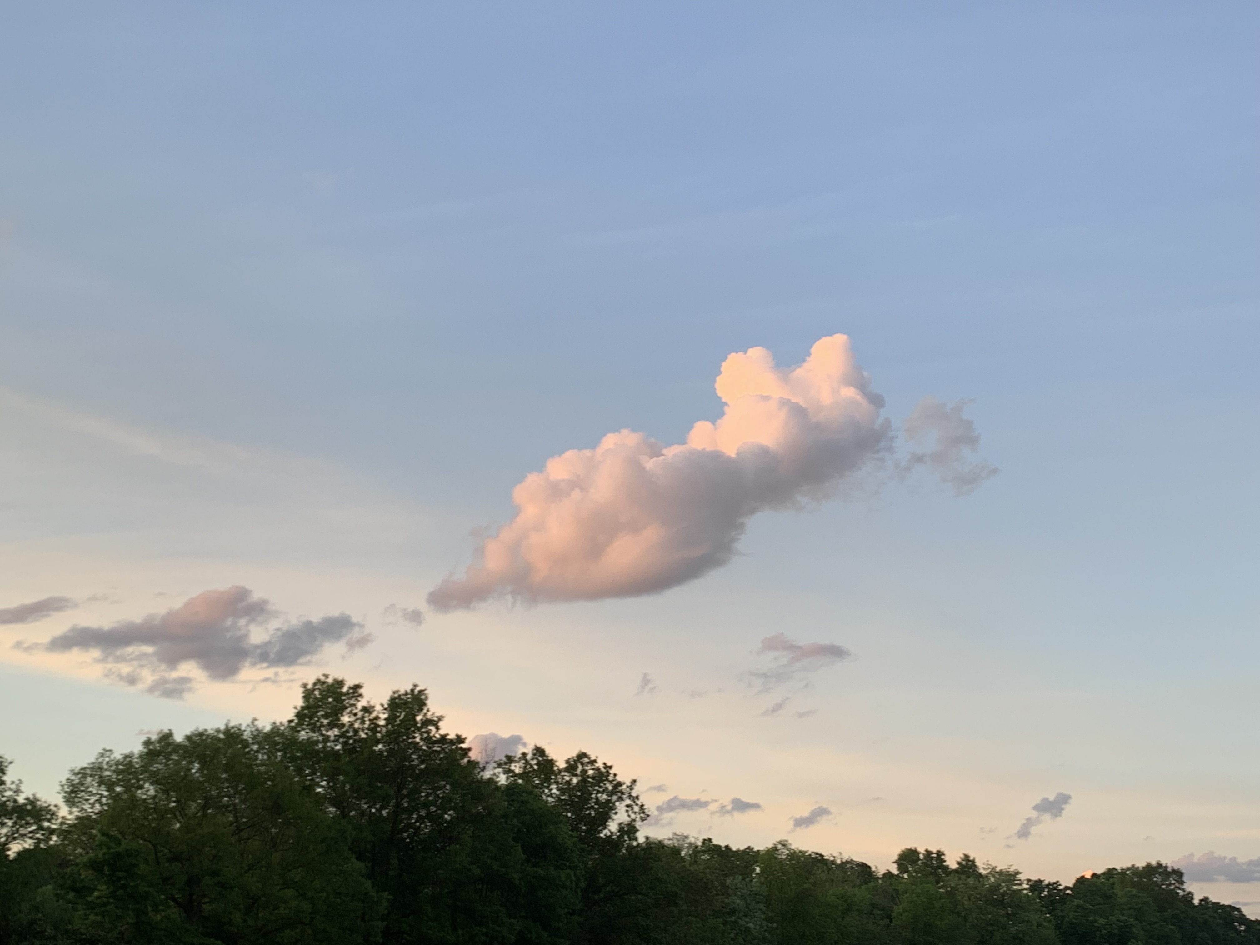 My latest original five-line poem. I’ve mentioned before how music often inspires these little poems, and well, sometimes nature does, too. So much so that I can’t ignore it. I was out walking my dog this morning, and saw this cloud hanging off to the left side of a field over the tree line, and it felt so dang close that I could touch it.