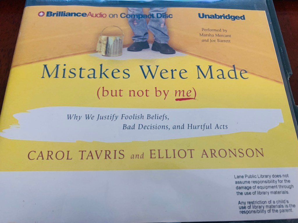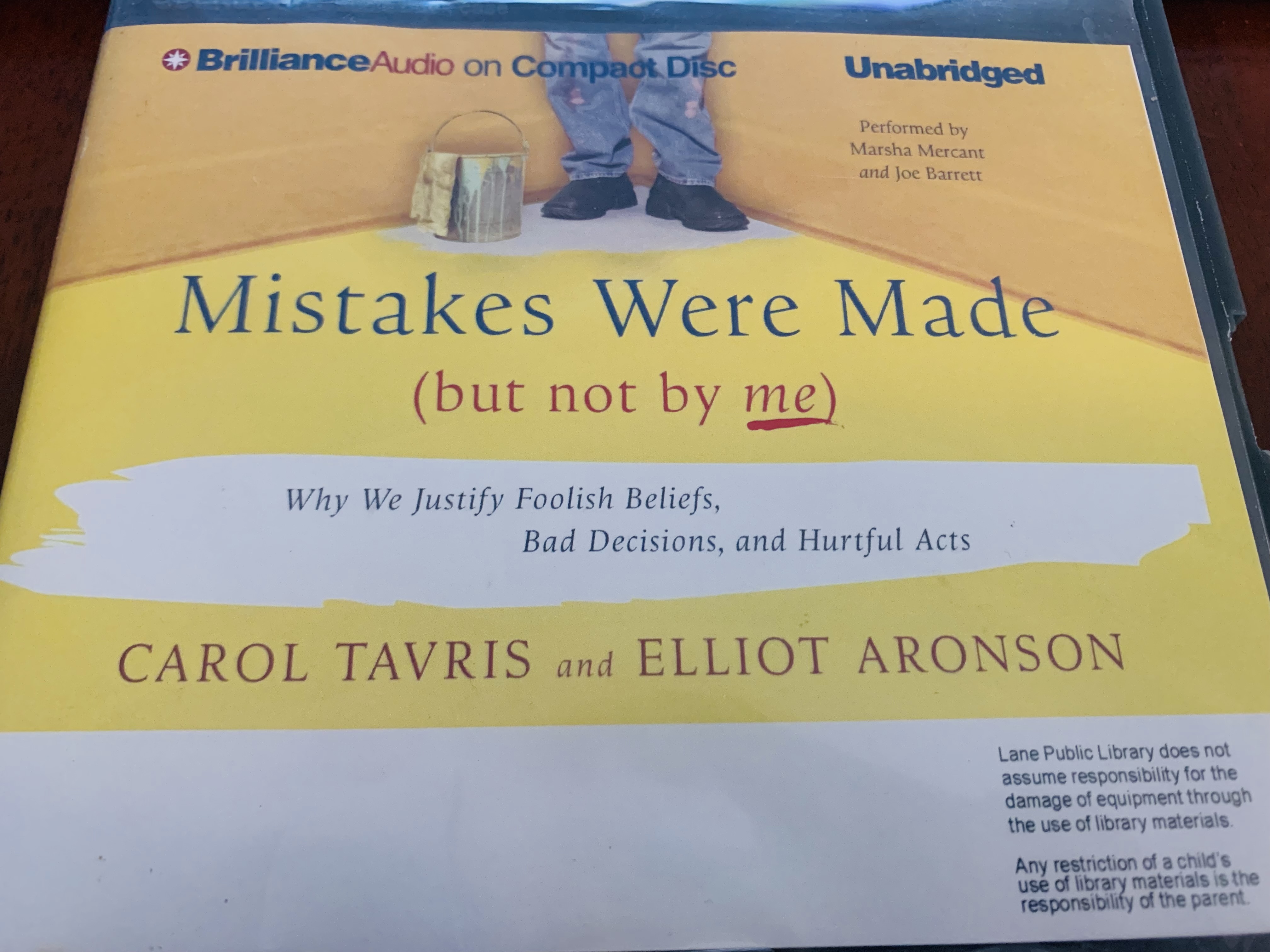 A paradox quickly becomes apparent in the book, which Tavris and Aronson pointed out: Becoming aware of psychological blindspots, like our need to self-justify ourselves, only serves to deepen them because someone reading/listening to this book will think, “Yeah, but that’s not me.” Admittedly, my brain wanted to go there, too! Because I like to think I am an open person, willing to admit fault, and willing to be seen as stupid, if the situation calls for it. After all, I was a journalist for much of my working life, and repeatedly asked stupid questions to better understand something.