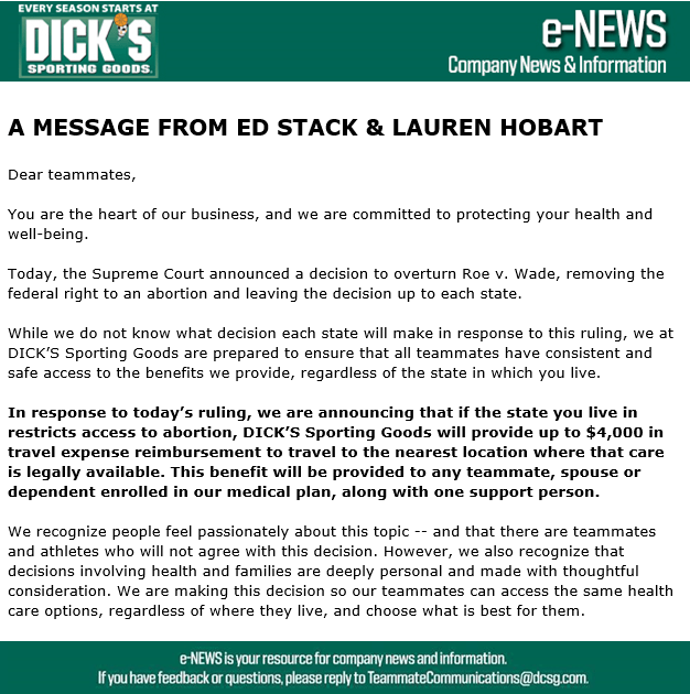 Today, after seeing what many companies are doing, I now see that as another workaround solution. So, if you’re not familiar, companies are coming out and saying that travel expenses related to abortion are now part of their medical coverage for their employees. This is important with respect to women in states where abortion is and/or will be outlawed and/or severely restricted because now, those women must travel inordinate amounts to the nearest abortion clinic.
