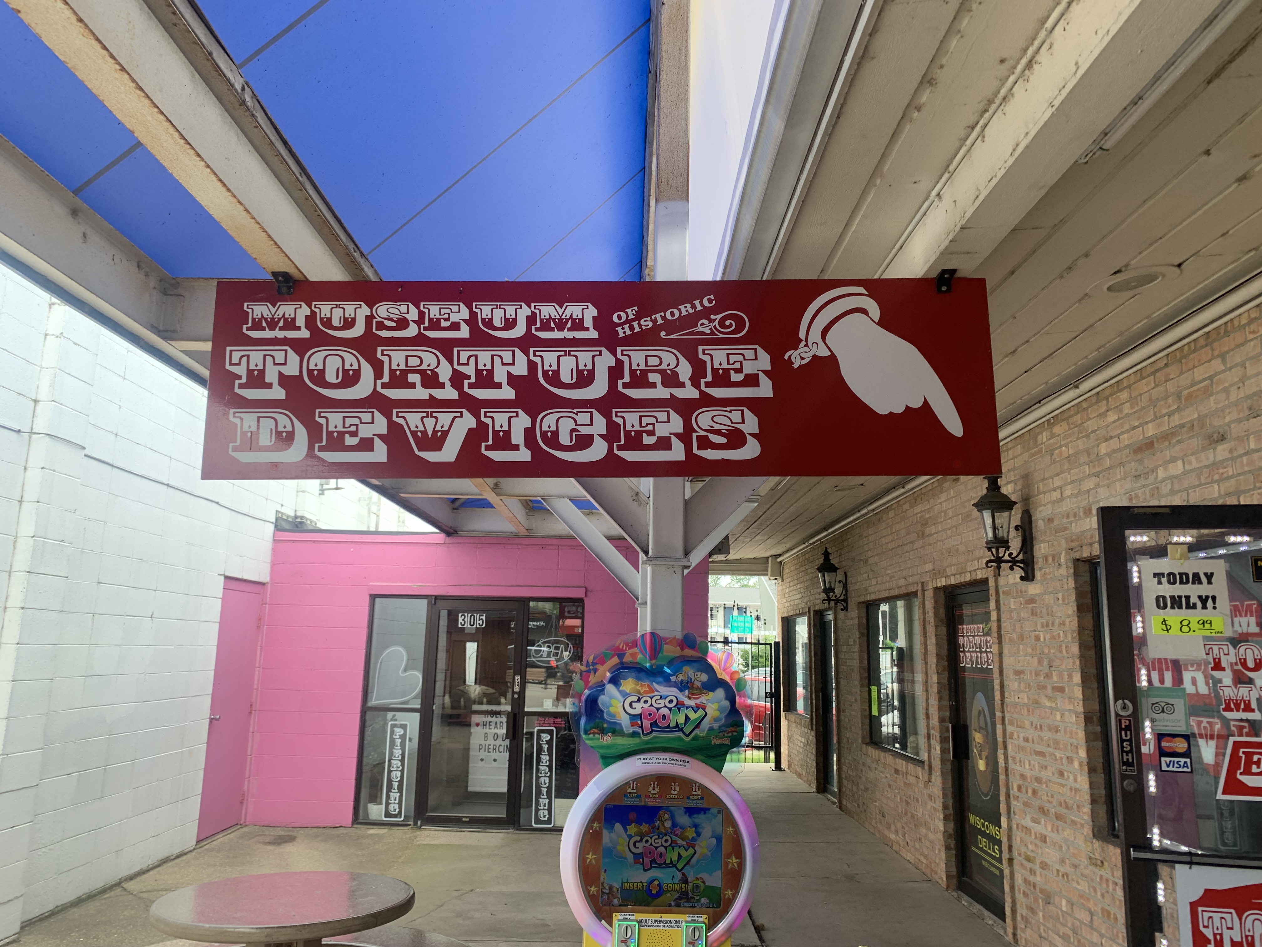 One of the most oddball features of Wisconsin Dells, where I recently traveled to, is that in this oasis of waterparks, go-karts, and arcades, sits the Museum of Historic Torture Devices, slightly off the beaten path of Broadway Avenue in downtown Dells, with its 27 fudge shops (slight exaggeration), boat tours and even a THC shop.