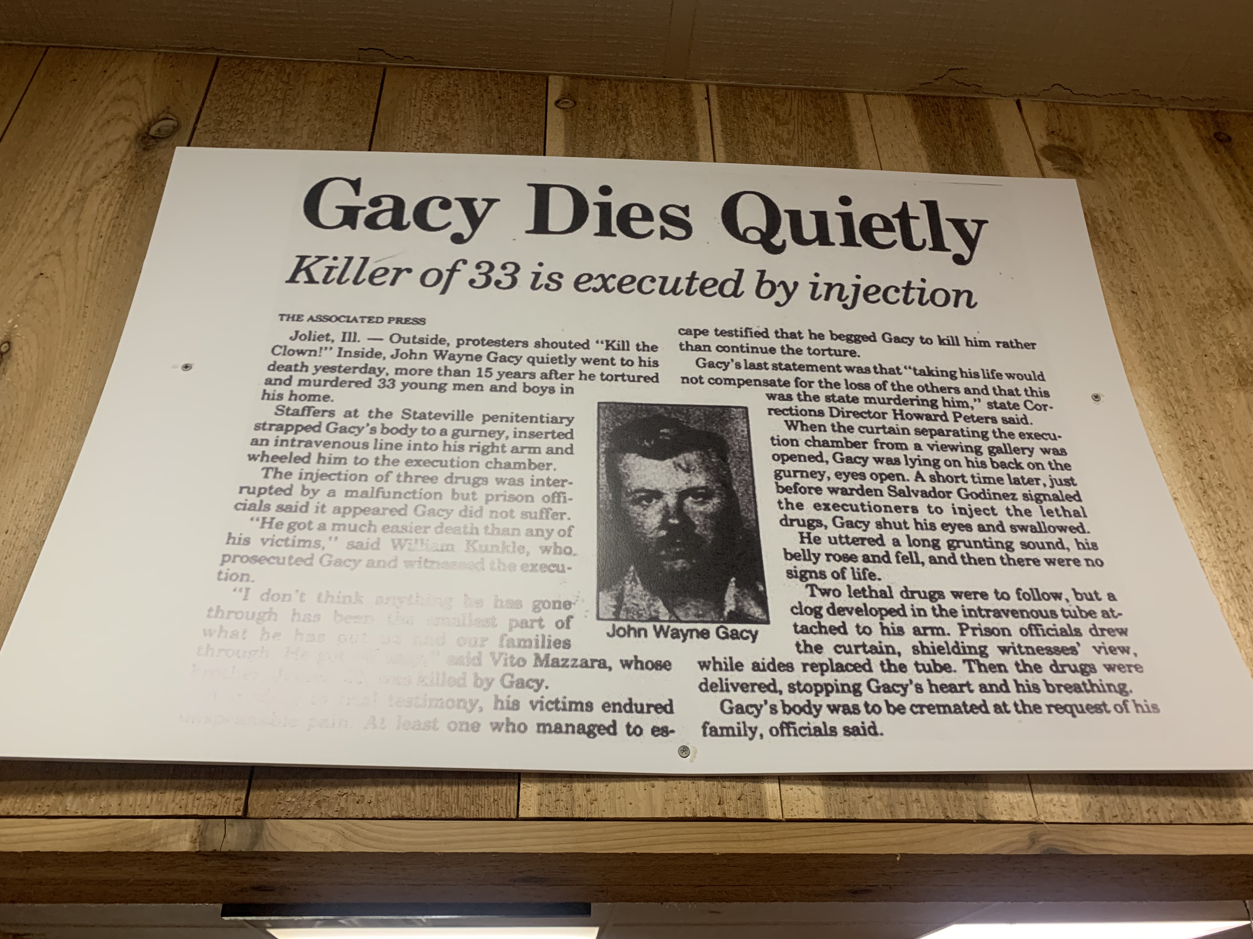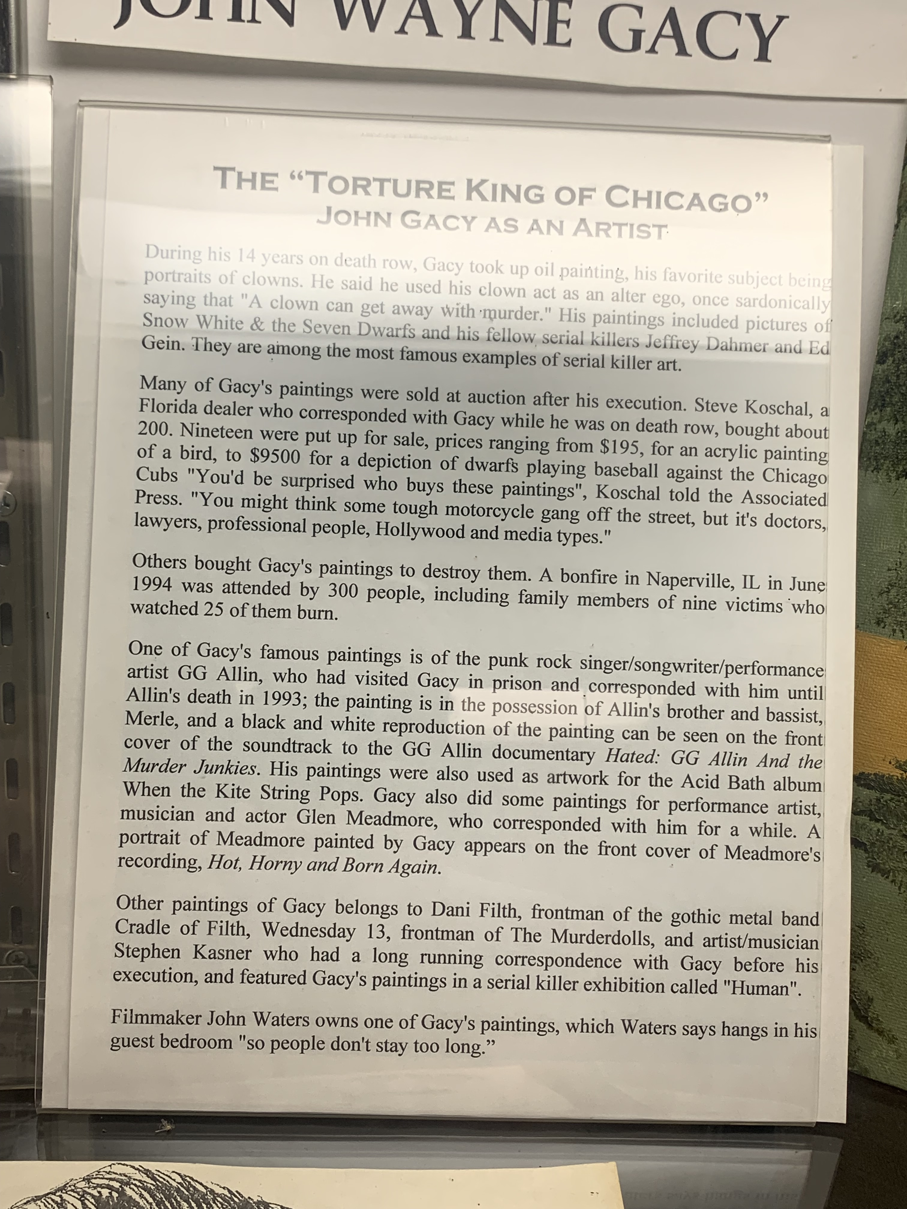 But what torture museum would be replete without an exhibit on notorious serial killers, such as John Wayne Gacy, Jeffrey Dahmer, and two others I’m blanking on at the moment? In fact, as I was paying my admission to the museum, the curator said to me, “Are you familiar with John Wayne Gacy?” I said I was. He then said the Museum had the most exclusive Gacy exhibit around, and that if I know Gacy, I will appreciate it. Something to that effect.