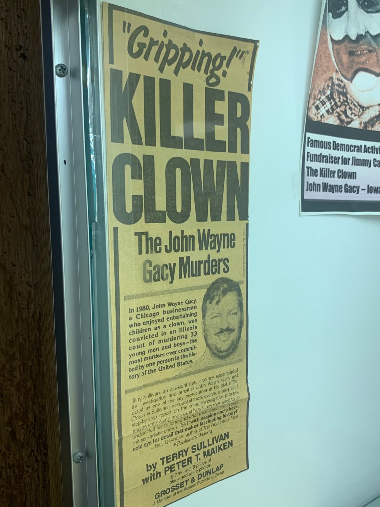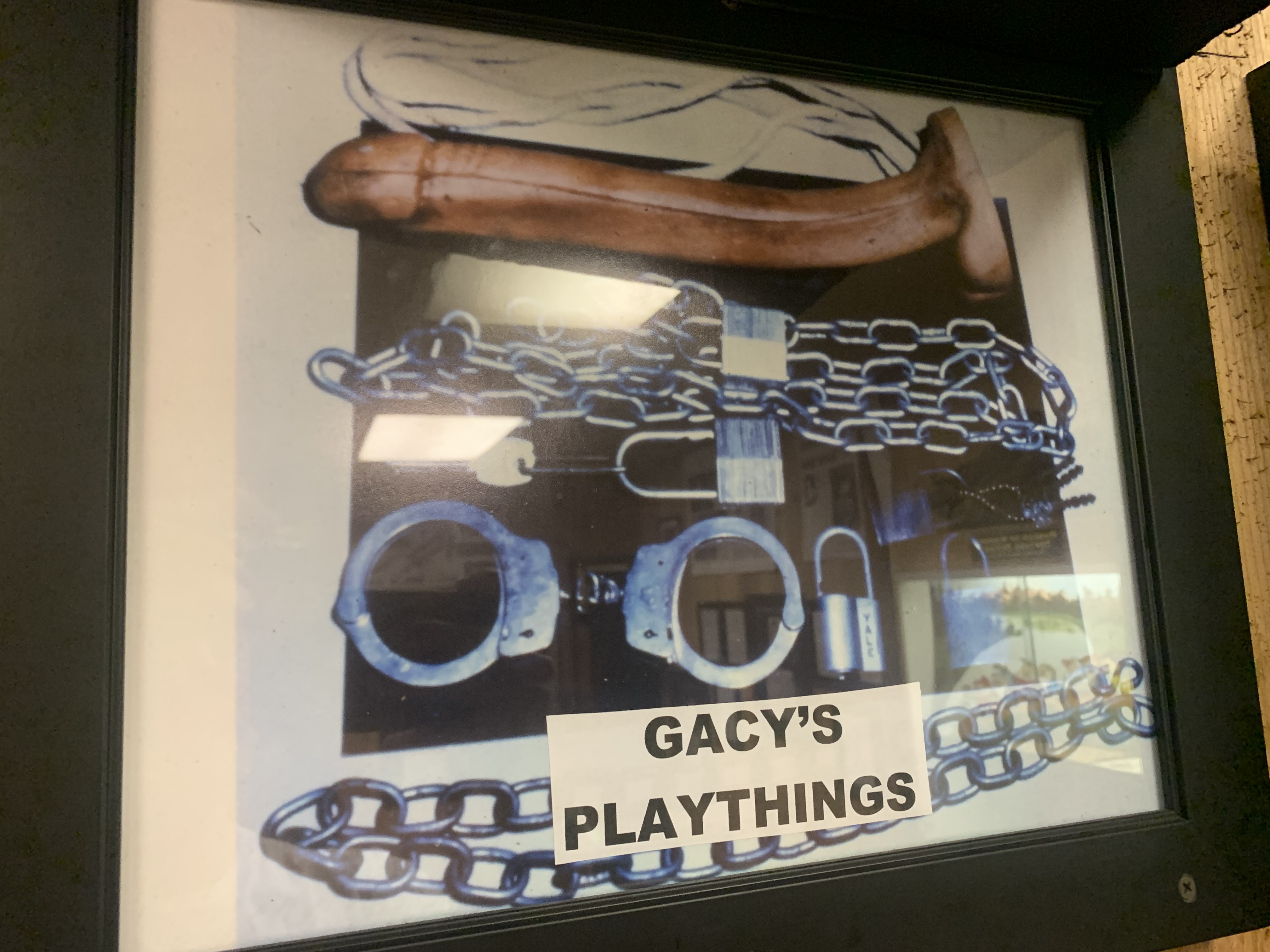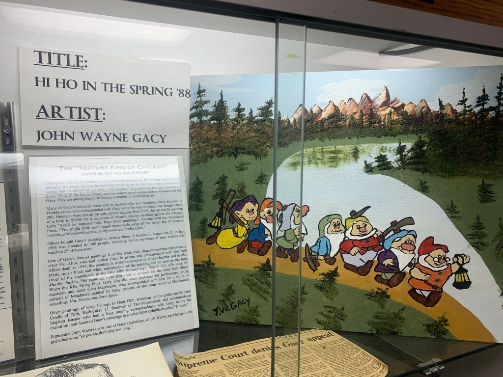 Gacy was a clown in his day job, and a serial killer and sex offender at night, raping, torturing and murdering at least 33 young men and boys in the 1970s. His victims were buried under his house in Chicago in the crawl space. The exhibit at the Museum featured images of some of those corpses recovered (yes, I know I’m really weird), newspaper clippings of his arrest and conviction, and even his infamous paintings of … Snow White and the Seven Dwarfs? The exhibit also featured “Gacy’s Library” and “Gacy’s Playthings.” The former contained a bunch of dirty magazines (some more explicit than others), and the playthings, well, that’s self-explanatory.