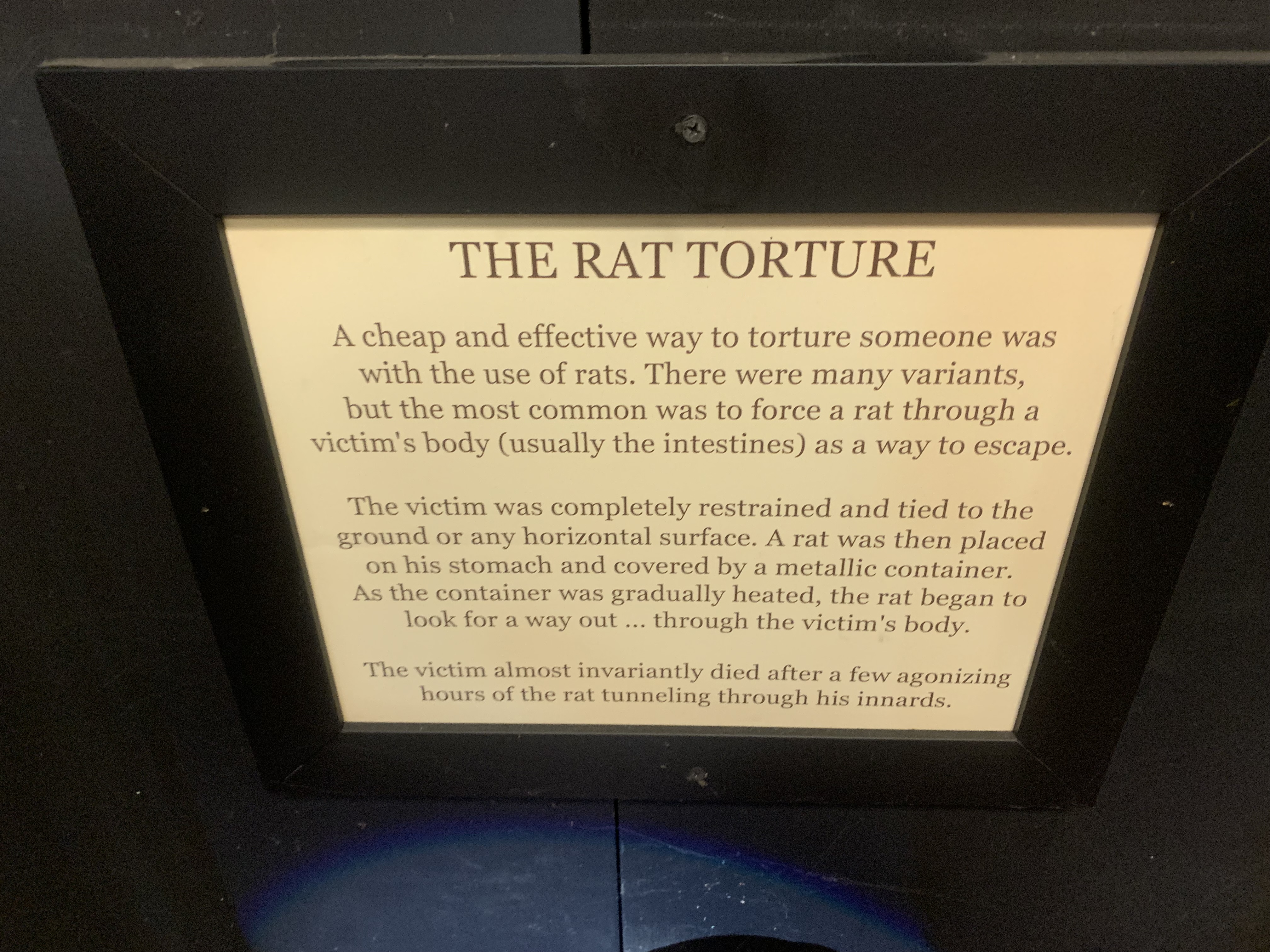 The worst torture I saw in a museum dedicated to awful torture was actually one of the last ones I saw on my way out: Rat Torture. This “cheap and effective” way to torture someone consisted of forcing a rat through a victim’s body (usually the intestines) as a way of escape. To do this, they would restrain the victim, place the rat inside a metal container on the victim’s stomach, and heat the container; thus, the only way out for the rat would be through the victim’s stomach.