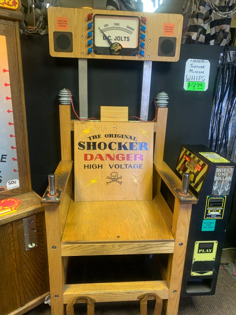 At the end of the museum, I obviously paid the $1 to sit in the “toy” electric chair, where it simulates a shock in you as you hold the handles. I did this once as a kid at the Ripley’s Believe It Or Not! Museum in Tennessee. This one only had one handle for one hand; I was later told by the curator they had complaints about it being two intense with two handles, so they turned off one of them. Which, I can see that! Because even one handle was actually pretty intense of a “shock” feeling. If it had gone on for a few seconds longer, I would have started to get uncomfortable.