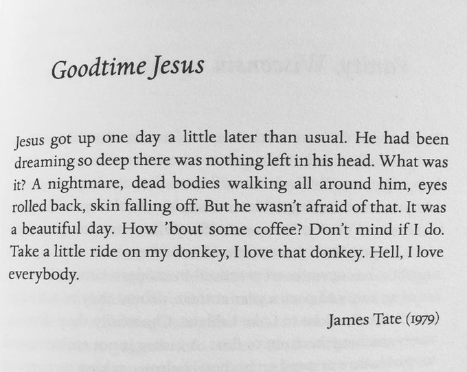 An unconventional poem, both in structure and in content, particularly religious content, always speaks to me. I think it speaks to me because of my inner anarchist and contrarian, albeit, that doesn’t mean chaos or contrarianism for its own sake, but purposeful deviation from the norm. In this way, I think American poet and professor, James Tate’s, 1979 poem, “Goodtime Jesus,” is an exemplary poem to demonstrate what I am talking about. I’m not sure I’ve come across it before. I’ve also not come across James Tate, despite him being a Pulitzer Prize-winning poet. After reading this poem, I wouldn’t mind reading more of his work.