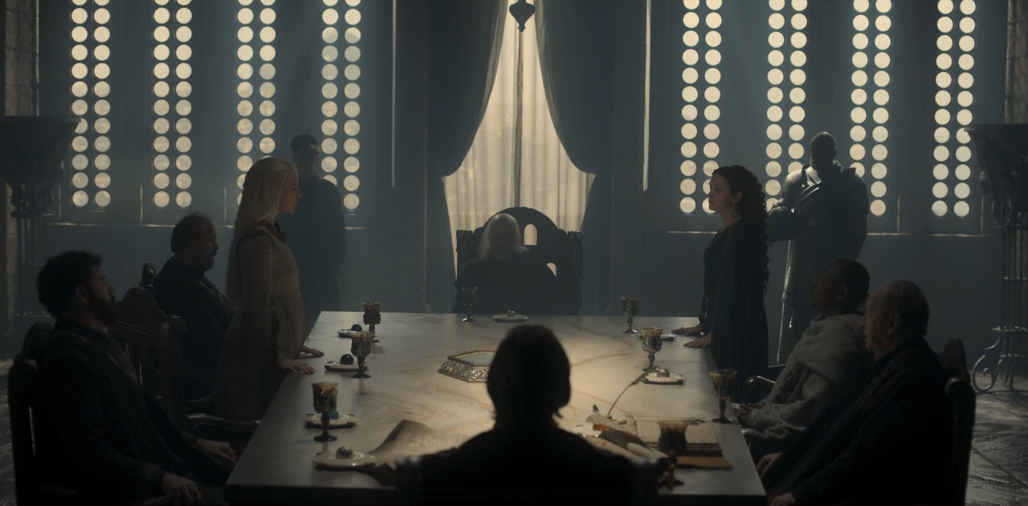 The most surprising aspect of episode six of House of the Dragon, “The Princess and the Queen,” — an episode that jumps the story 10 years into the future from the prior episode, replete with a cast change; now Emma D’Arcy is playing Rhaenyra and Olivia Cooke is playing Alicent — is that King Viserys, who we last saw collapsing at the wedding of Rhaenyra and Laenor, is still alive! Granted, he looks like a walking corpse and is still haunted by a damn rat, and is as delusional as ever about Rhaenyra, but he is still alive, all the same. A sign of how decrepit the King has become and loosening ability to control his kingdom is that the Small Council he oversees as King basically seems as inept as ever. Not only that, but the Queen has taken more of a forward-facing position at the table, talking far more than she did 10 years ago.