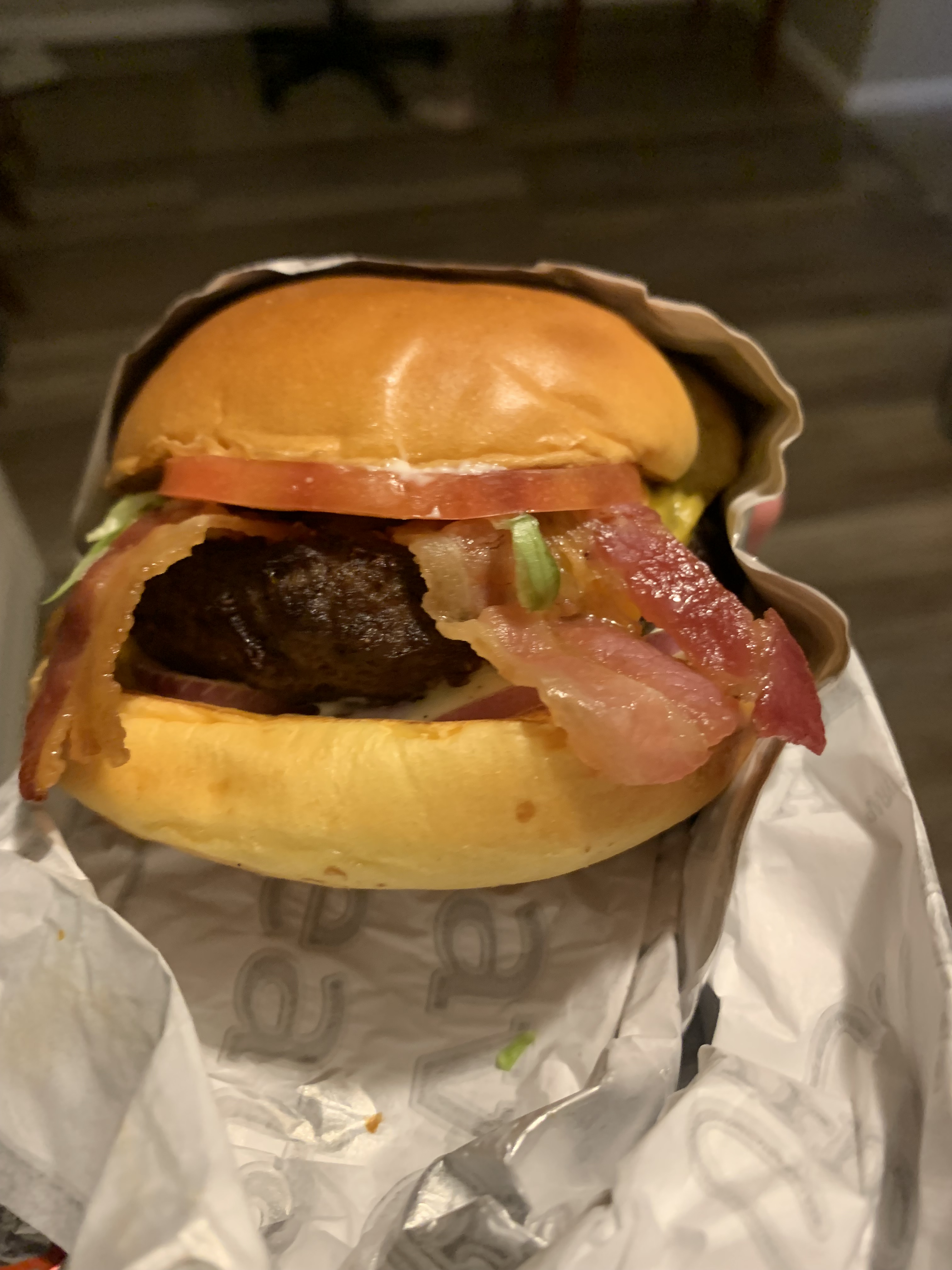 From the Arby’s site, the burger is: wagyu blend burger topped with American cheese, shredded lettuce, tomato, pickles, onion and burger sauce on a toasted buttery brioche bun. Made with a blend of Wagyu and ground beef. Limited time only at participating locations while supplies last. Well, that’s curious, what does “wagyu blend” mean? Is it a wagyu cut or not? Maybe it’s the usual beef mixed in with some unknown percentage of wagyu beef? Whatever the case of mysterious beef, I obviously said, “No, thanks,” to the pickles. I forget what other option they offered, but I got the burger in the ranch bacon variety, which is self-explanatory.
