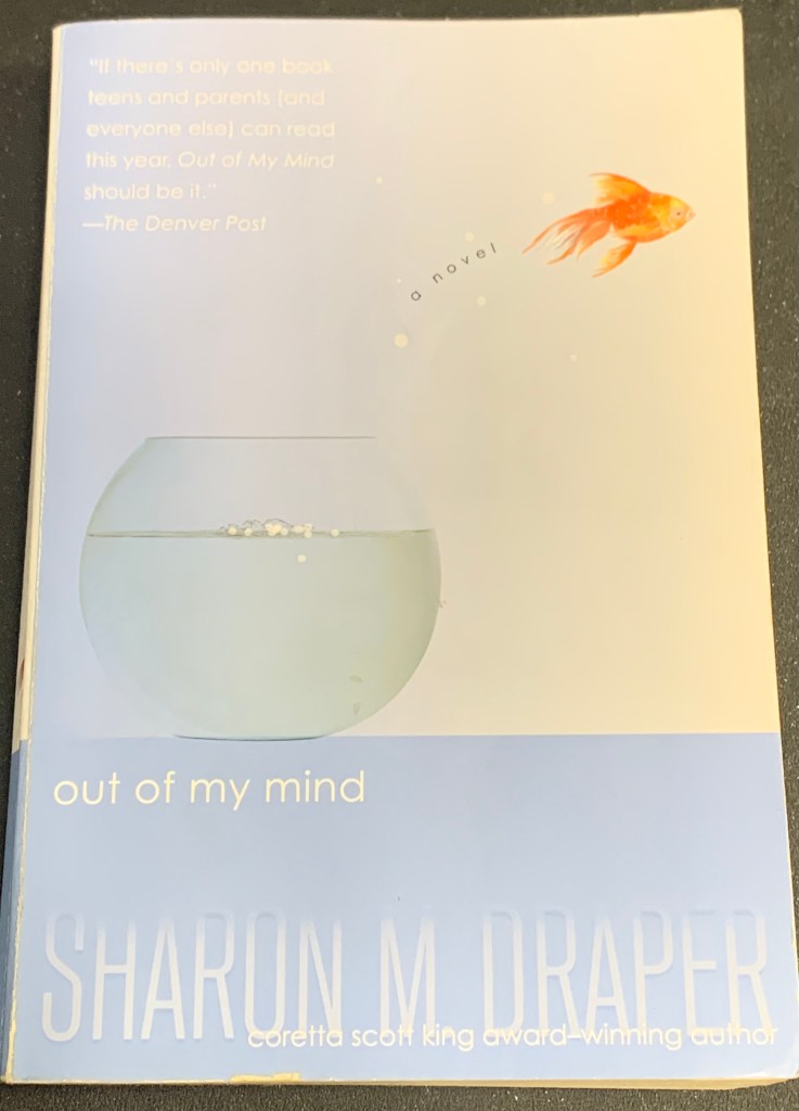 We’re just two lost souls swimming in a fishbowl, year after year … I couldn’t help but think of the Pink Floyd song, “Wish You Were Here,” after reading Sharon Draper’s 2010 YA novel, Out of My Mind. Except in the case of this book, it was one lost soul. The character, Melody, has cerebral palsy and is in a wheelchair, with a seemingly photographic memory, but the inability to verbalize her thoughts to anyone. As such, she compares her situation to a fish in a fishbowl, and even later in the story, she gets a pet fish named Ollie who flops out of his fishbowl and dies because she’s unable to get her mom’s attention soon enough (foreshadowing for something else later in the book, too). And of course, the cover of the book is that of a fish sailing free of its confinement in the fishbowl. More than wanting to walk (although she certainly wants to dance!), Melody just wants to be able to talk. To tell her parents she loves them.