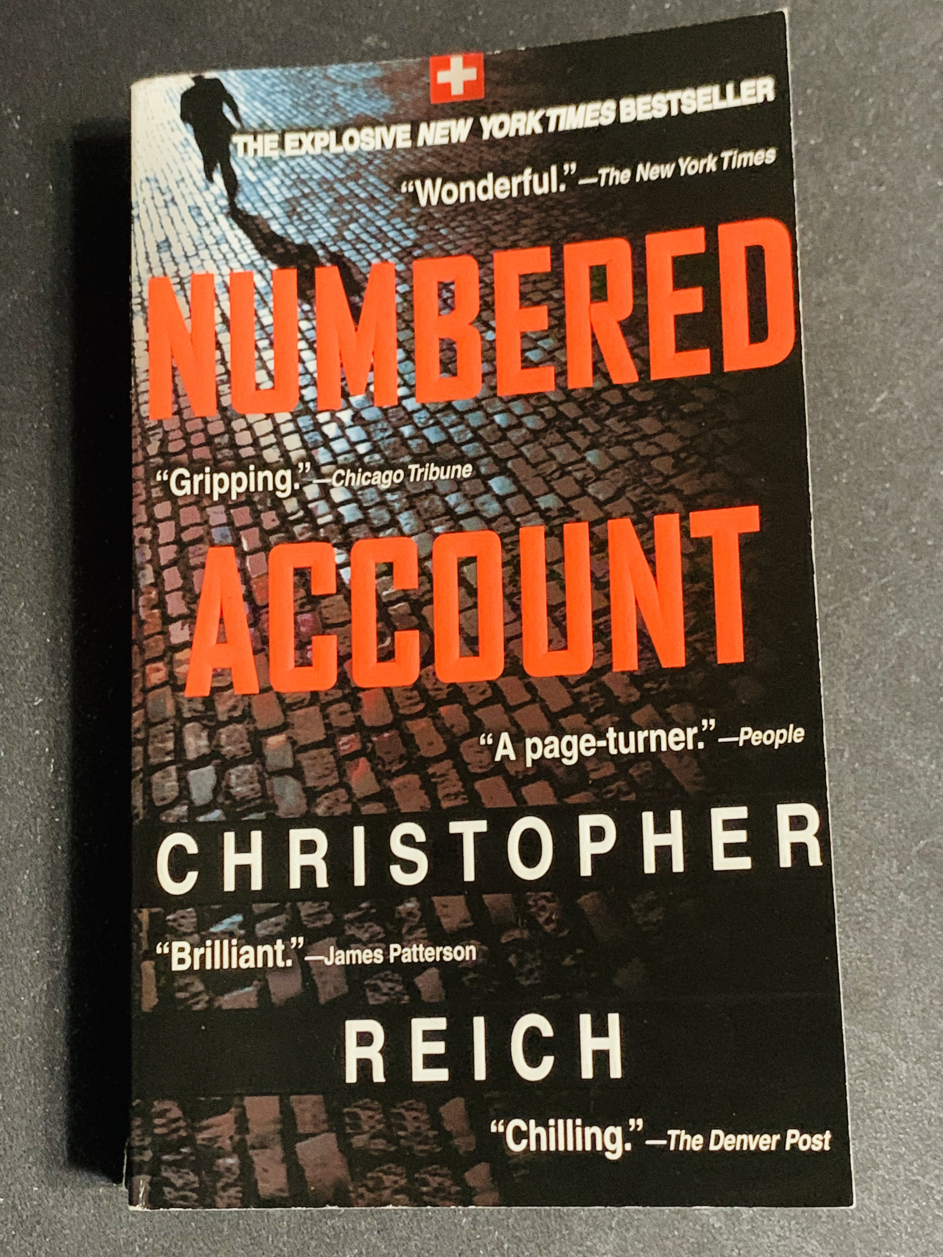 A 750-page book about banking intrigue and conspiratorial plotting — banking! — and Swiss banking at that, shouldn’t have been as enthralling as it was, but my brain was properly titillated by Christopher Reich’s 1998 book, Numbered Account. I’m not much of a finance guy on a personal level by any means, and on an intellectual level, I’m interested in economics, but not so much finance. Some of the banking and finance lexicon and maneuverings in Reich’s book went over my head for that reason, especially because he authentically worked in a Swiss bank, but that only gave the book even more legitimately, and there’s a direct relationship between an increase in legitimacy and an increase in my titillation at the unfolding plot and bank intrigue. I don’t like to look into a book until I’ve written my review (I’m adding this addendum after having done so), but today I learned, a “numbered account” is primarily a Swiss bank feature, where an account holder’s account is known through their number rather than their specific identity.