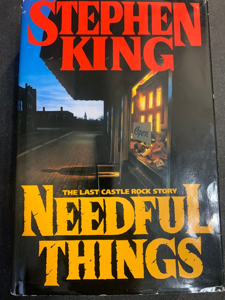 As we’re approaching fall, you fall-lovers (like me) might appreciate this analogy: falling back into reading Stephen King is like putting on that familiar, comfortable sweater again. His style, with the parenthetical line breaks, italicized madness, movie, music and other cultural references, ensemble casts in a small town, shocking violence, and supernatural horror afoot with that quintessential crap-hitting-the-fan moment, all just fit so nicely once you start up with him. In this case, I read what is billed as “The Last Castle Rock Story,” 1991’s, Needful Things. Castle Rock, a small town in Maine, of course, being the site of many of King’s novels: Cujo, The Dead Zone, The Dark Half, and others. And I’m pretty sure it’s not actually the last Castle Rock story. Nonetheless, what transpires in the book sure feels like it could have been the last Castle Rock story.