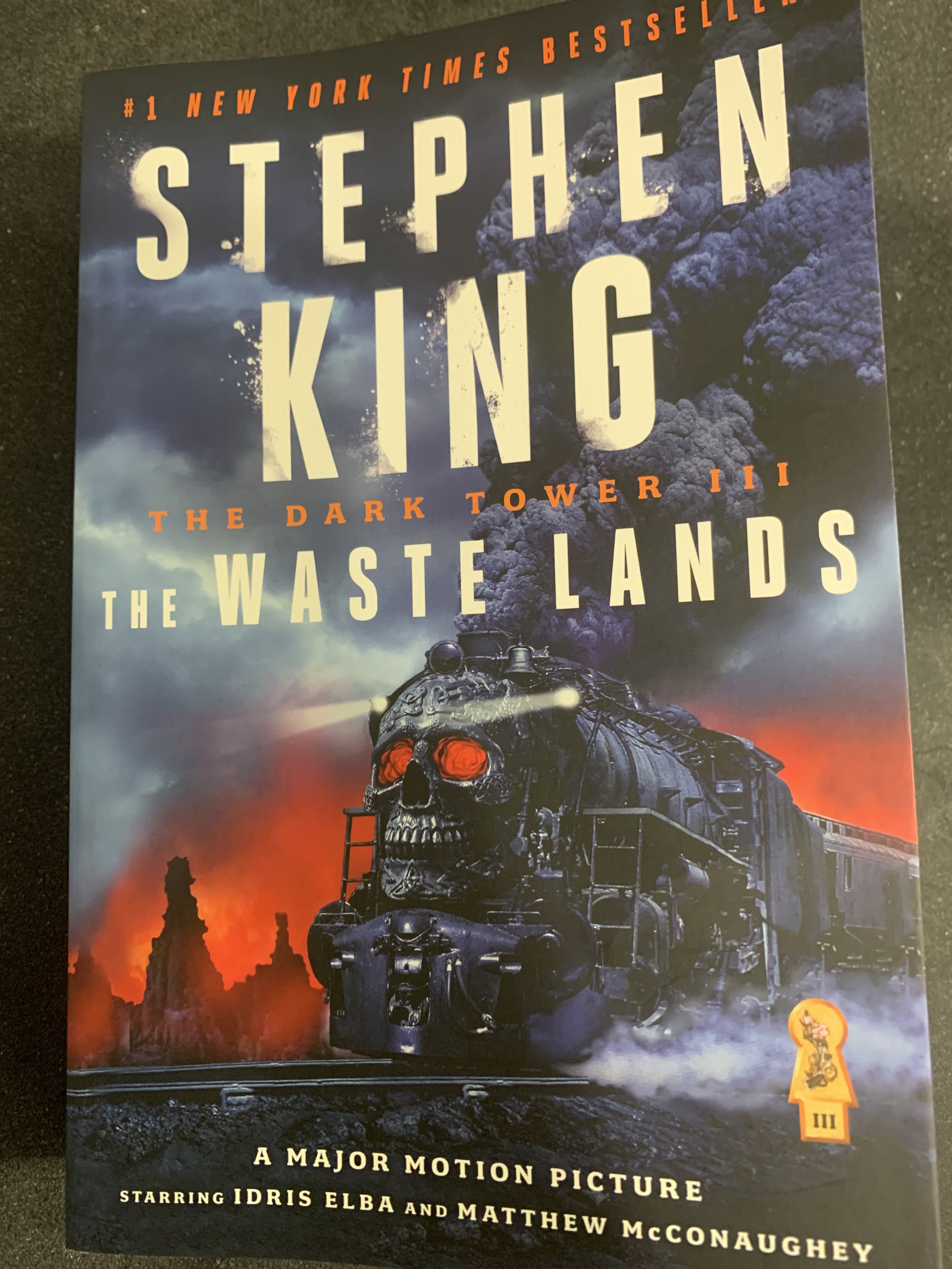 You might just say I’m still on the Dark Tower choo choo train, with Stephen King’s 1991 book, The Waste Lands, the third in the series. Last we left off with our merry band of travelers — Roland, the gunslinger; Eddie, the reformed heroin addict; and Susannah Dean, the double amputee who no longer has a split-personality per se — they were finally going beyond the beach into the hills of Roland’s world, with a blossoming love between Eddie and Susannah (which I think gets more earned in this third book).