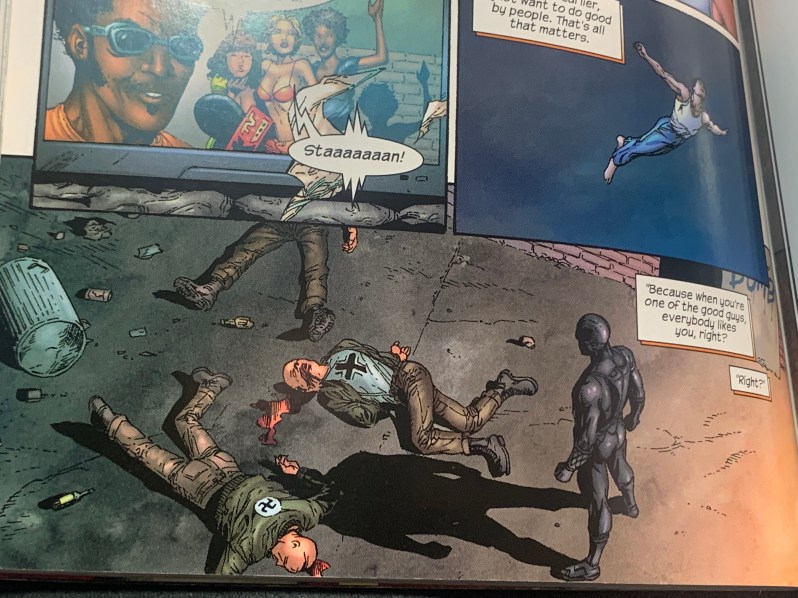 There is also Richmond, who goes by Nighthawk. He’s Batman — no superpowers, just money, superior training, and the angst of watching his parents gunned down in front of him. The wrinkle in the Batman analogy is that Richmond is Black and his parents were killed in a hate crime by racists. So, when he’s prowling the night going after criminals, he specifically defends Black people from racists and Nazi scum. Nighthawk is grislier than Batman, too. In one gnarly scene, he rips an assailant’s ears off. When Mark finds out about him, he actually gives Nighthawk a lecture about the virtue of color-blindness and protecting everyone. Where you could see the seed of Mark’s lecture being the flower of his undoing and/or turn to the dark side is when he tells Nighthawk, “Sometimes, I think that only somebody who was truly an alien could solve all the world’s problems. Because only an alien could be objective enough to get the job done.” That’s definitely not Superman thinking! Eek. (Additionally, there is an allusion to a princess warrior type woman who made me think of Wonder Woman. She wasn’t developed further in this first volume, however.)