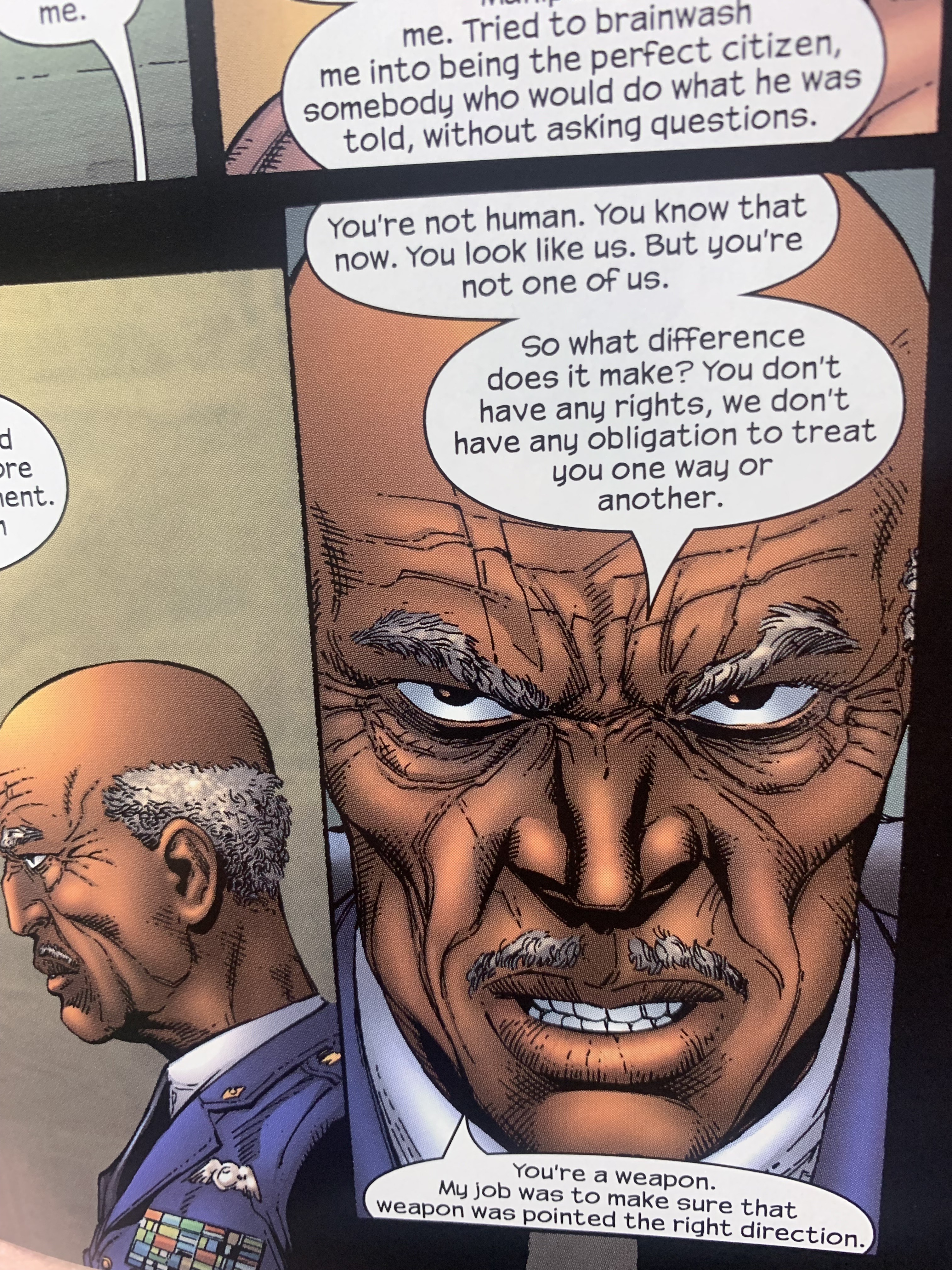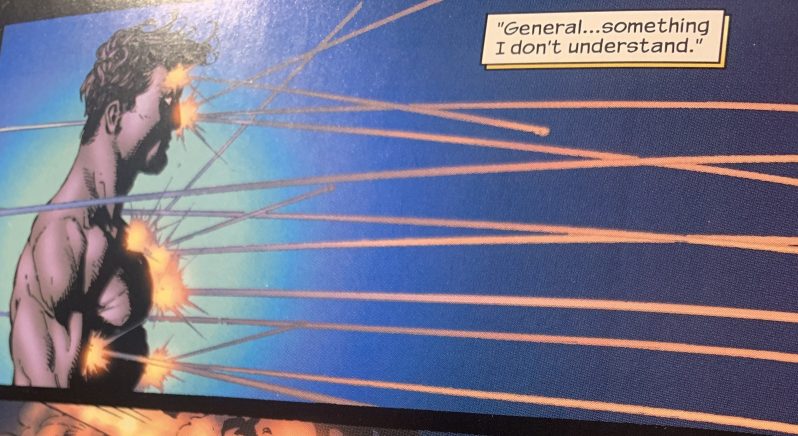 It should be said that Mark’s government handlers, whether General Casey of military intelligence who previously handled him, or his new handler at the National Security Agency, Bryce, are awful. Bryce thinks Project Hyperion should’ve been kept secret and then they could have used Mark to control the world, more or less. But Casey is a cuckoo bird himself. There’s a flashback scene of when the government first recovered baby Mark from the spaceship. Casey, even then, was inquiring about what it would take to kill the baby, if they needed to. In the present day, when Mark comes to confront Bryce and Casey, Casey sets off the equivalent of multiple atomic bombs (minus the radiation due to a new technological weapon) in a bid to kill Mark. It doesn’t work. Afterward though, the previously alluded to Princess, analogous to Wonder Woman, but evil, finally comes forth from her hiding place and helps to revive Mark. Princess Zarda was put into a spaceship and sent away along with Mark by their parents, the God of Night and the God of War, respectively. So, she’s godlike, too. Unlike Mark, though, she wants to conquer and rule the world.