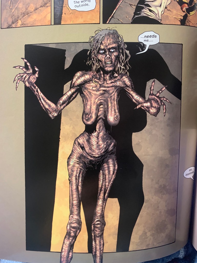 My favorite section of the book was #12, because there was a nice four-panel story structure from beginning to end: first, Mark and Zarda, as she tells him about his history in Italy; second, Richmond, Nighthawk (Batman-like), who tried to recruit Stewart Stanley, the speedster, to help him against what he suspects is a superpowered serial killer, killing Black prostitutes by ripping off their left arms, in Chicago; third, Dr. Steadman, the original doctor for Mark, who learns a terrible secret about “vDNA” in Washington D.C.; and fourth, a very foreboding and ominous panel set in Shreveport, Louisiana. Eventually, Mark flies away from Zarda, because he’s ready to do good for people in spite of the governments lies, and Zarda goes through Italy acquiring her outfit (she’s been naked this whole time). Stanley is put off by Richmond calling superheroes like him “you people.” Richmond, though, placed an ad in every newspaper to enlist Mark’s help. Mark comes, but he needs to “think about it.” Dr. Steadman learns another branch of the military is using alien virus DNA, or vDNA, on murderers to see what happens when the alien virus combines with human DNA. Many of the superpowered murderers then broke out of prison, and they need Mark’s help to capture them all. Before the military can kill Dr. Steadman, Doc Spectrum comes to his rescue. And finally, as I suspected was the case, Shreveport is the site of one of these superpowered murderers. Indeed, the one Richmond is after. In one gross scene, a woman flees from the man, and the panel just reads, “Eeeee … SKRUNNNCH.” Gross.
