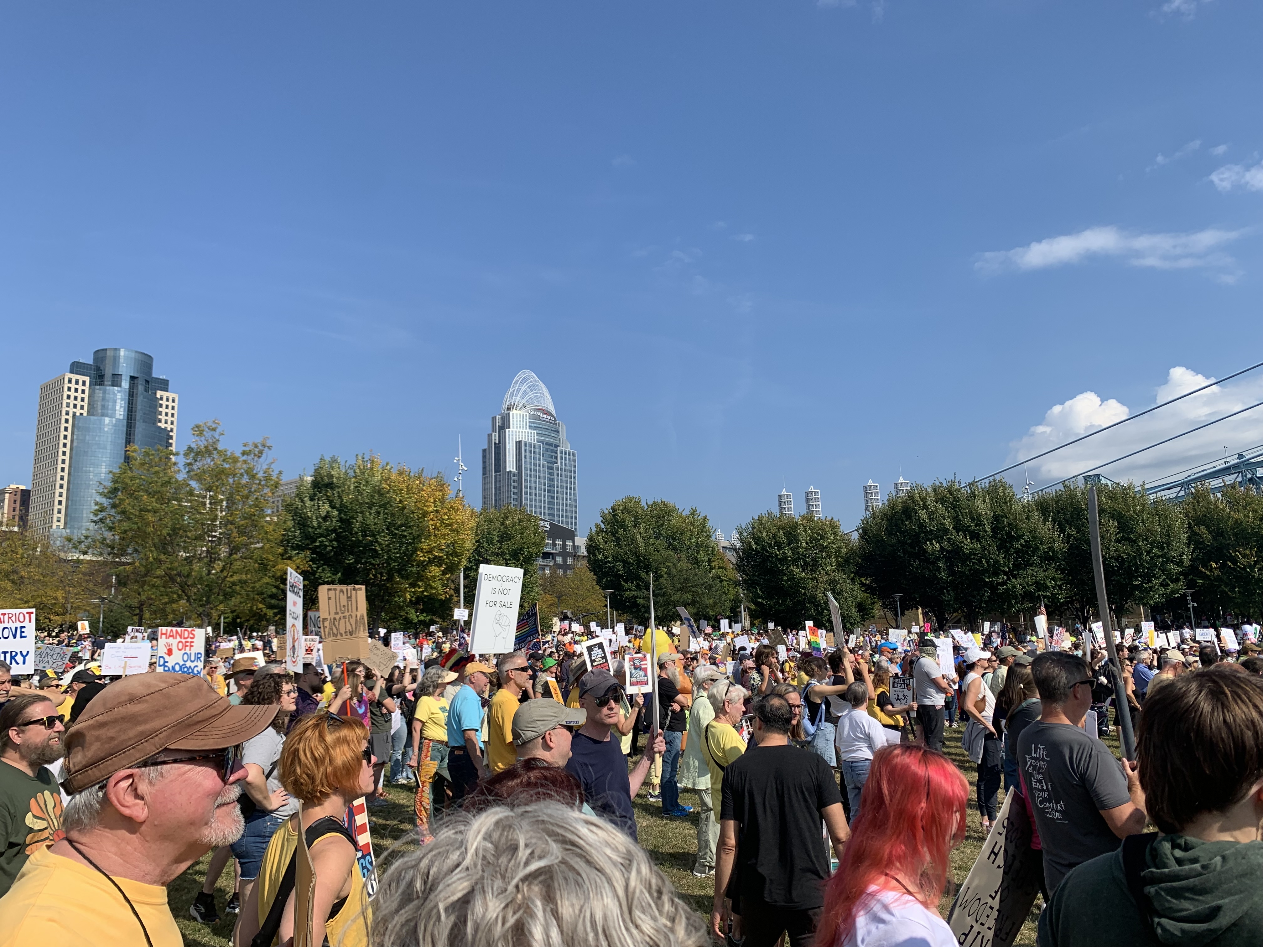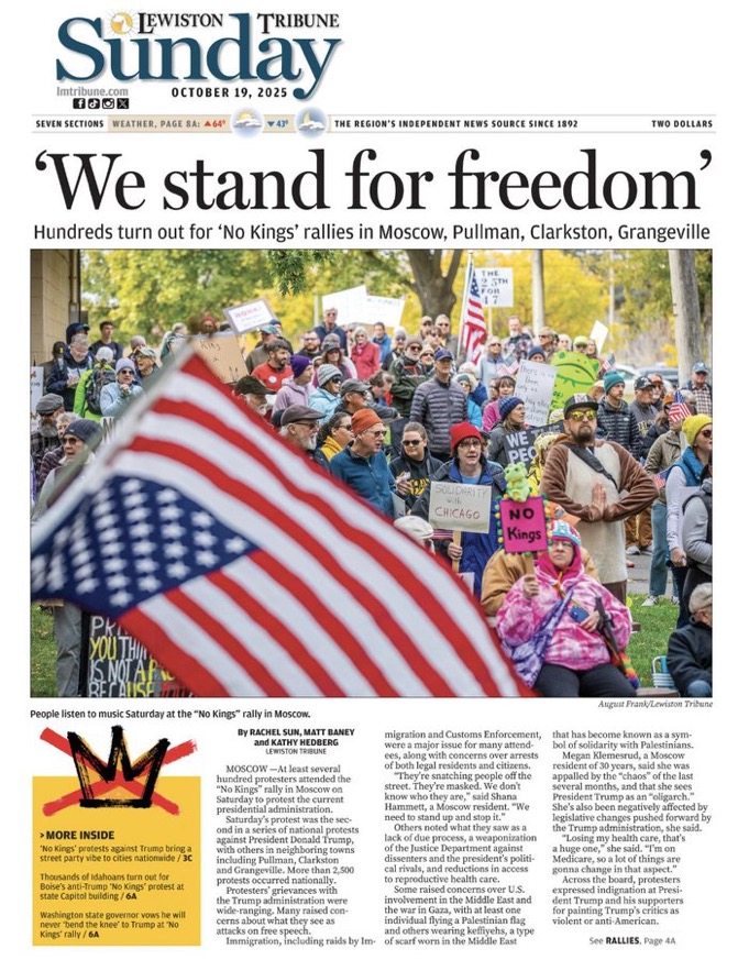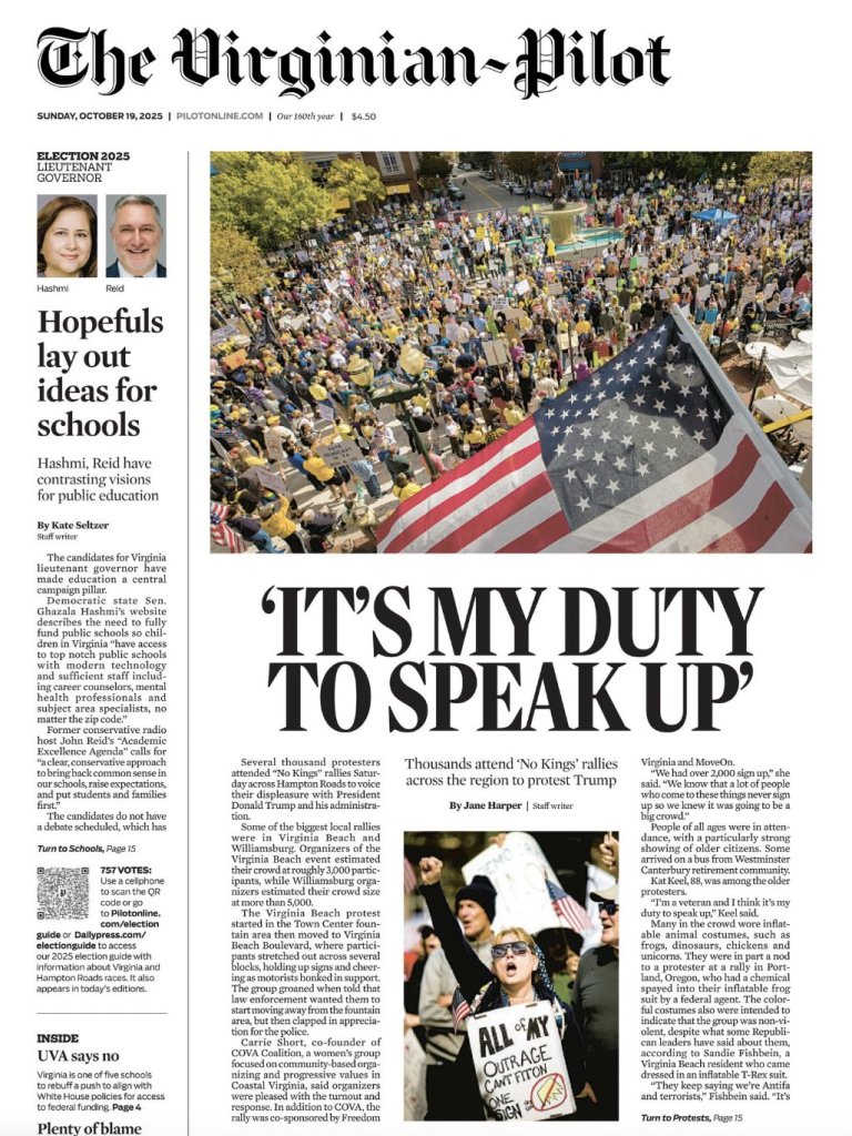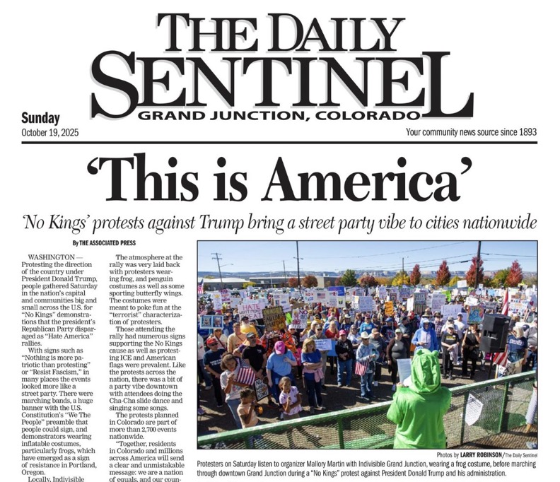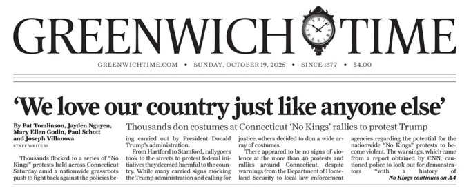 I attended the most recent No Kings rally and protest October 18. Once again, it was reassuring and hopeful to be with thousands of people (and see the millions elsewhere) who have taken the time to come out and say, “Not in our name. No kings. Freedom!” To be around people who recognize how not normal all of this is. To be around people who give a damn.