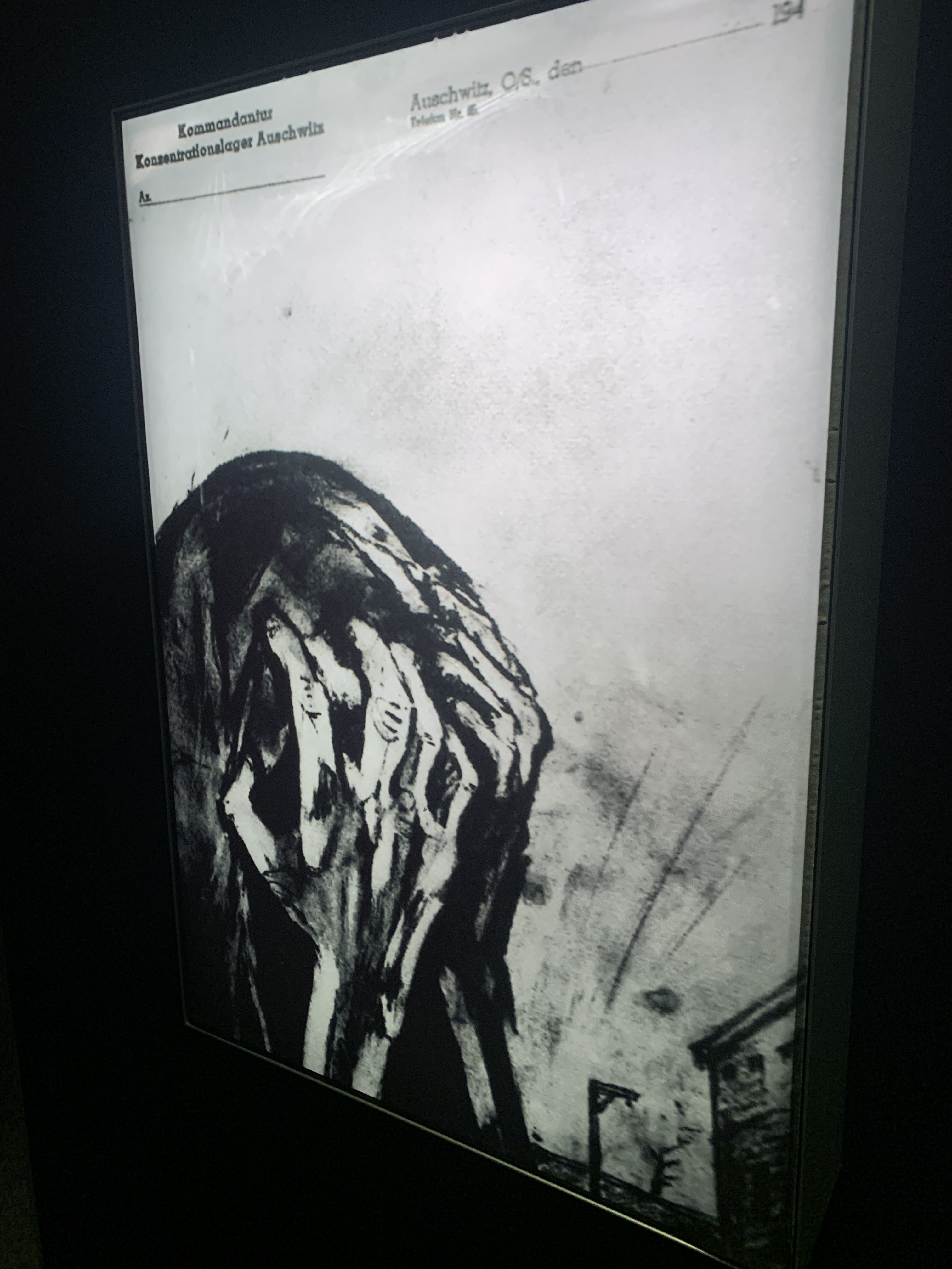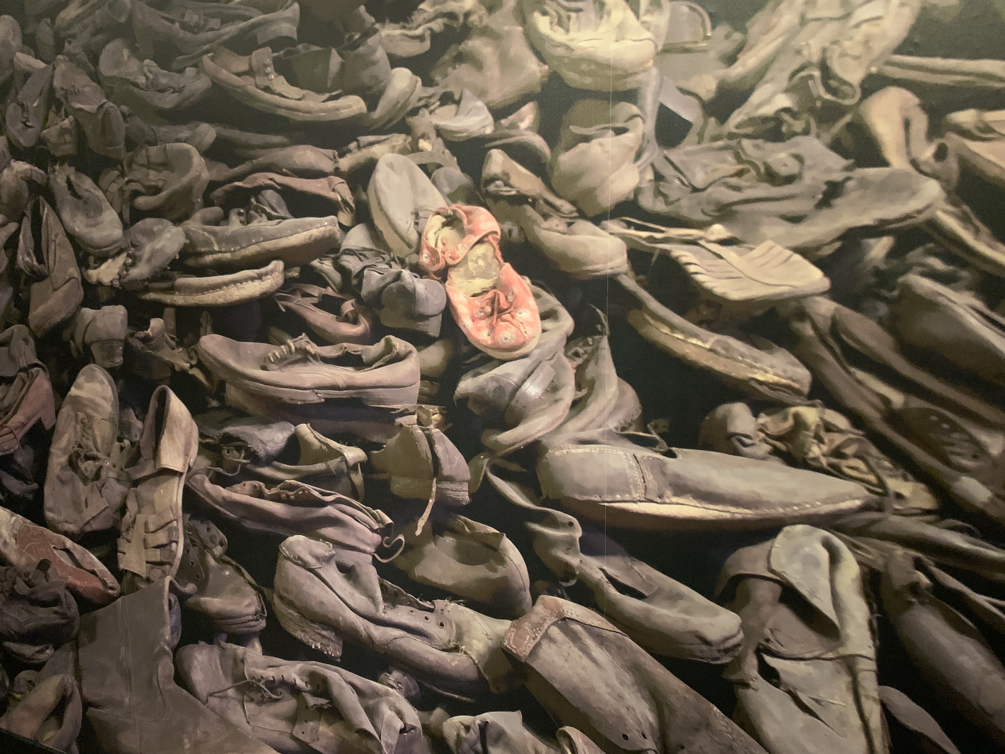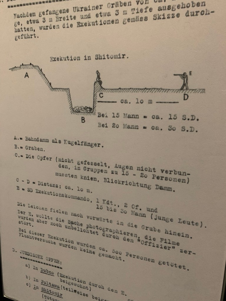 When I talk about the bureaucratic machinery of death, it’s quite literal. One of the most startling artifacts from the exhibit is a diagram of shooting procedure from 1942, which illustrates that murder procedures were standardized across the SS, and thousands were killed by bullets. There’s also a short video of such executions, with dozens of witnesses, including randomly a dog, and a rather bored seeming executioner smoking a cigarette. Another horrific aspect of the exhibit was the matter-of-fact way children were executed. A shoe with a sock still tucked inside of it is an artifact left behind now as a testament to such cruelty.